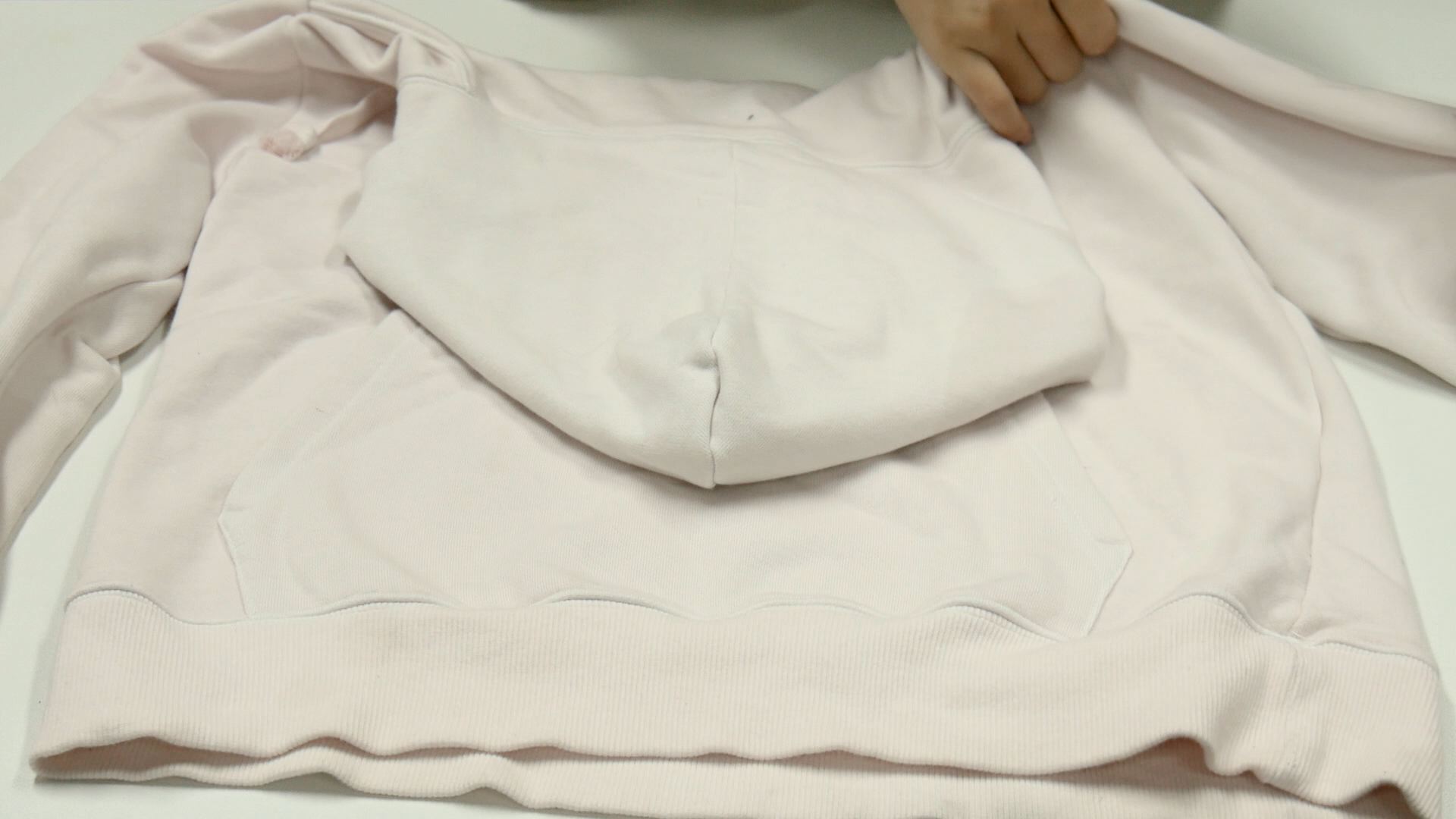 以卫衣为例,先将帽子折叠,两边的衣袖先收起来,再以衣袖为折线,将两边分别折起来,对折后将边边的都收起来即可。