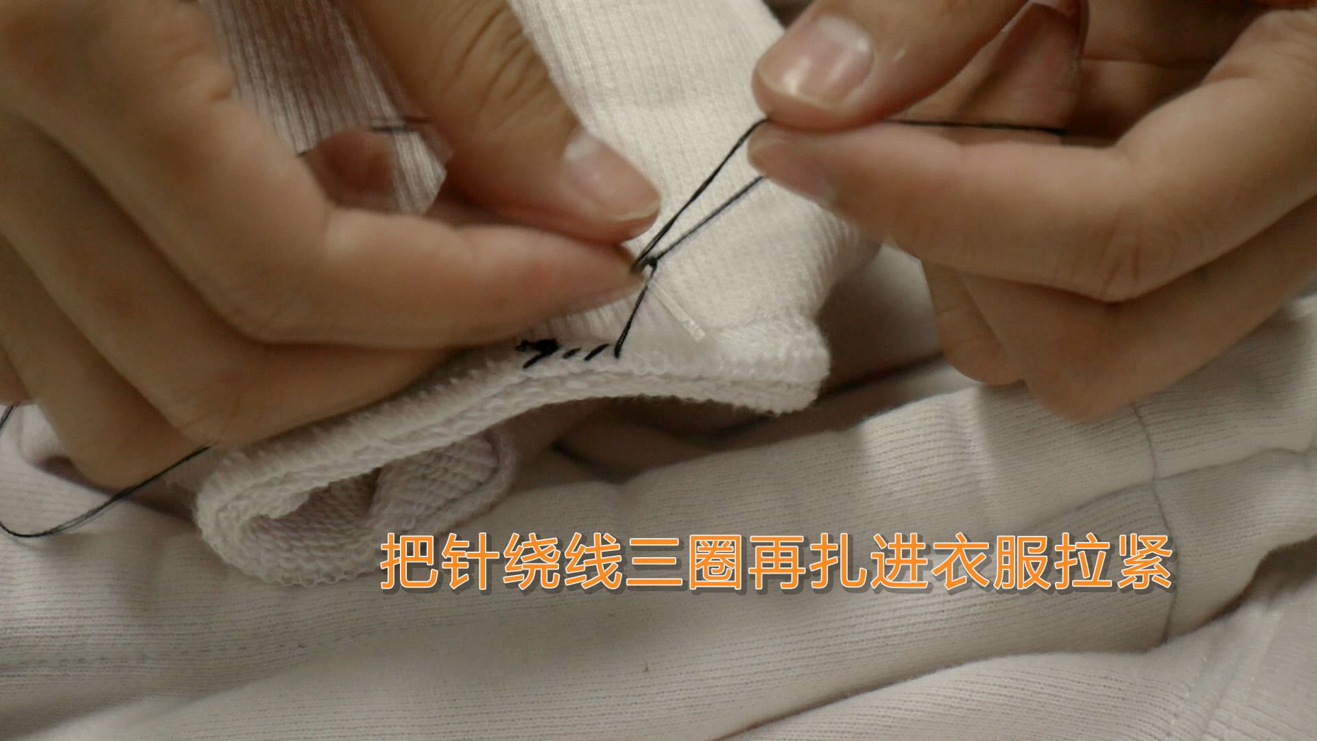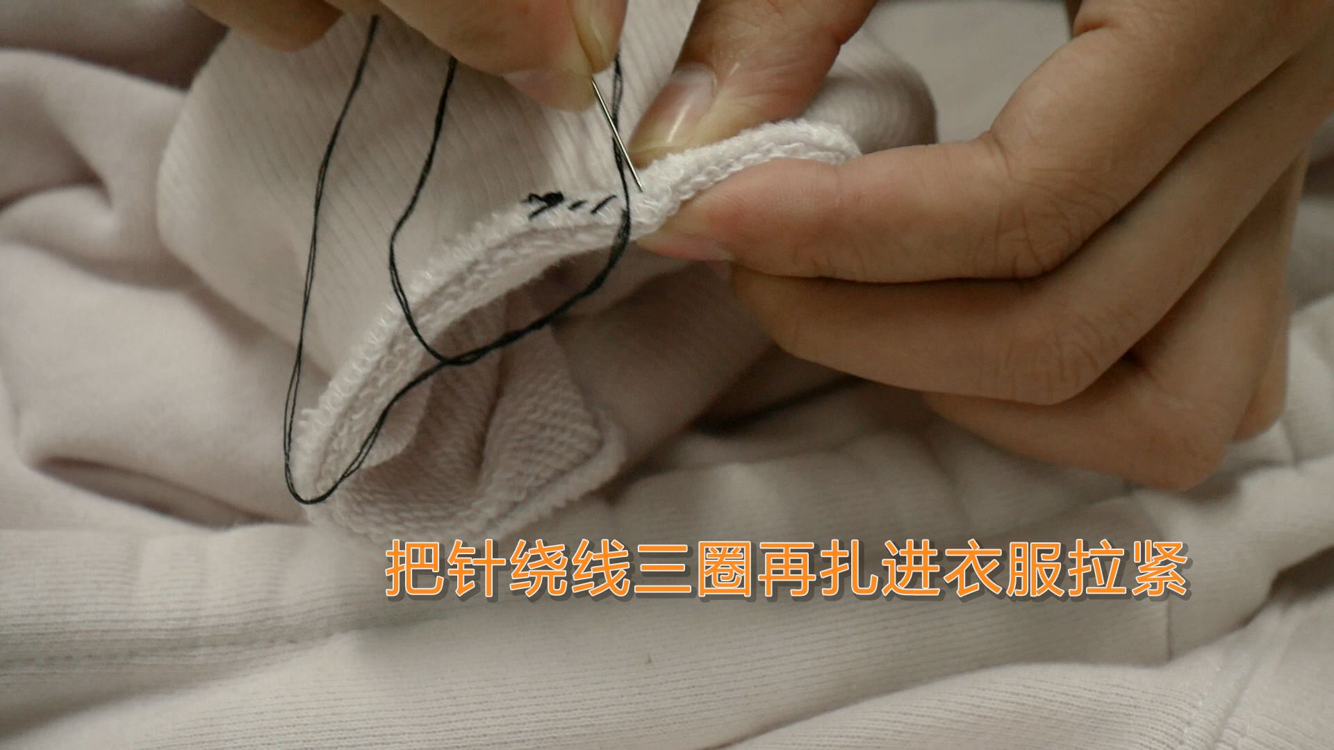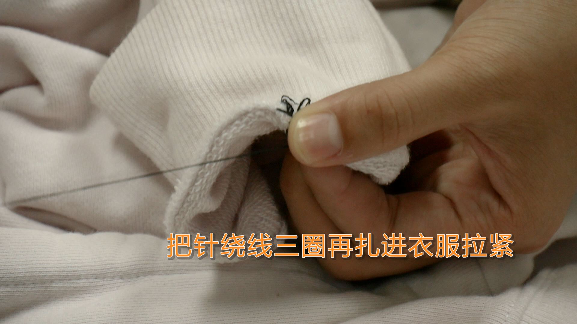 左手拇指和食指捏住线头,右手拇指和食指持针,用针将线头按在右手食指上,右手拇指按住绕好的线,左手将针抽出,即绕三圈左右,右手拇指按住绕好的线,左手将针抽出。