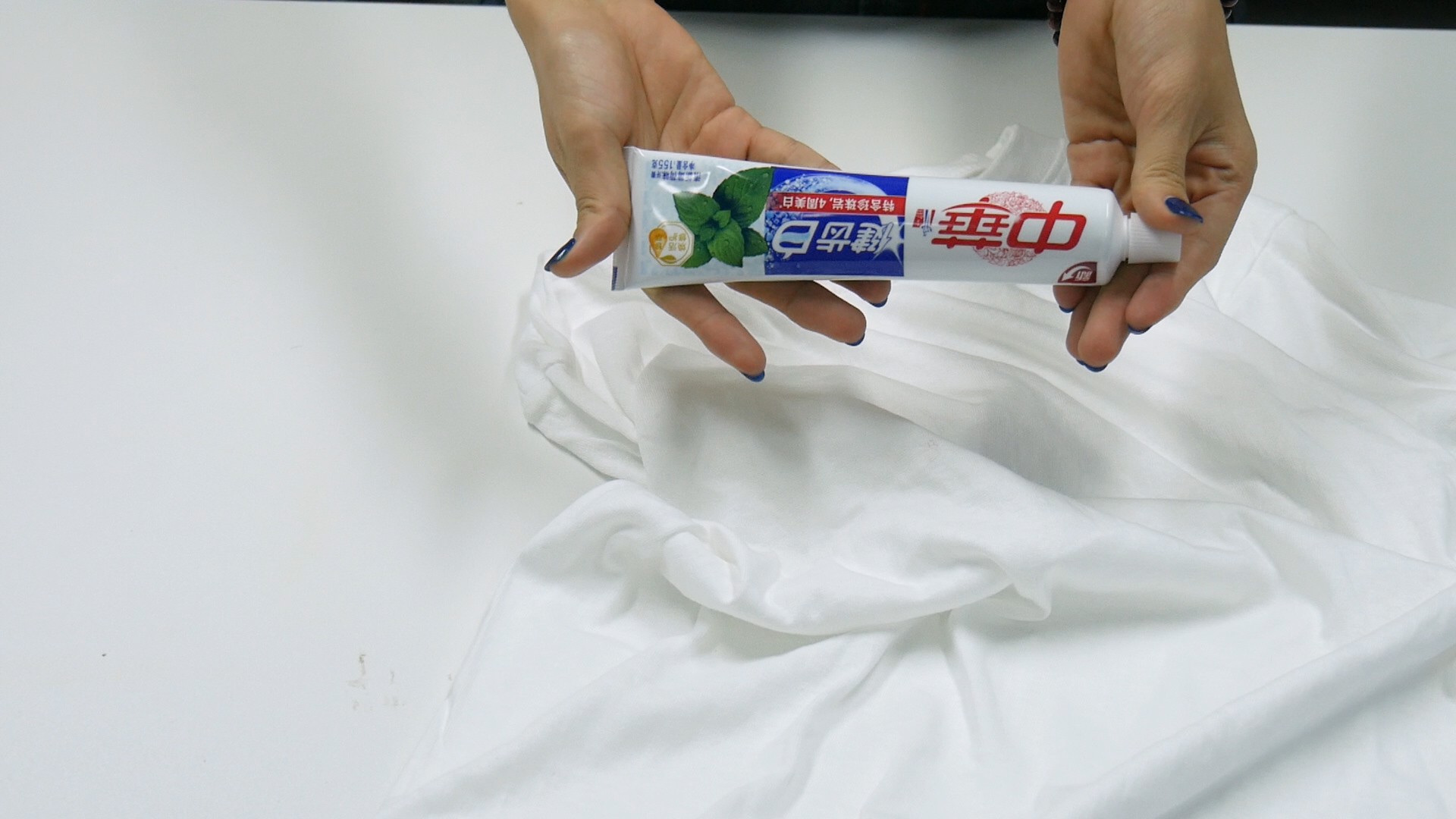 将牙膏挤到衣服上的口红处,涂抹开来。