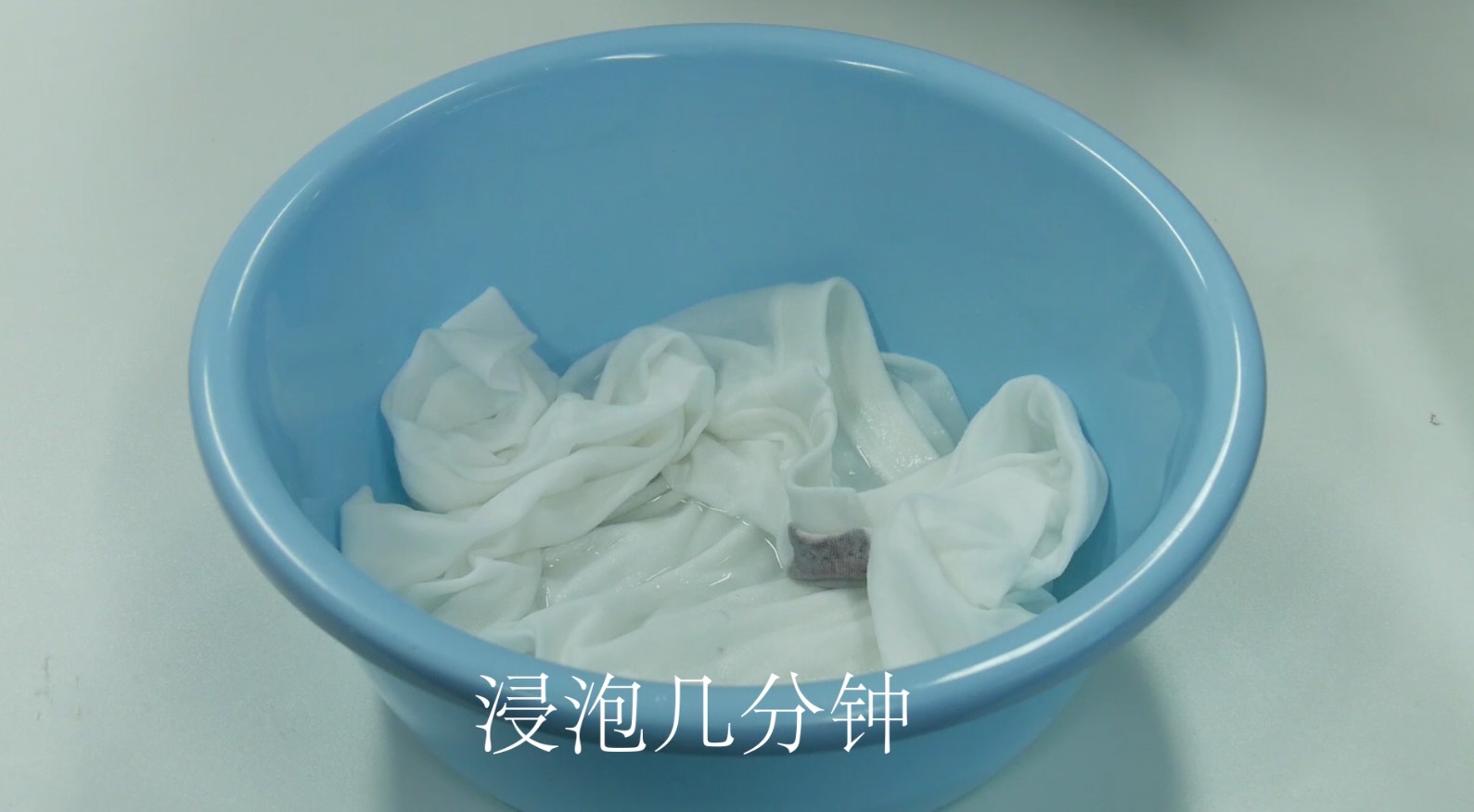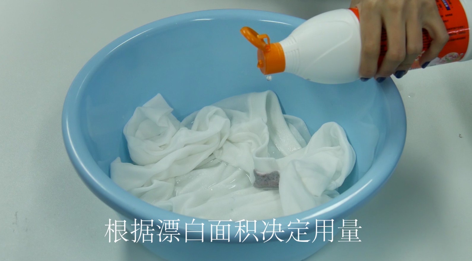 白色织物的将消毒液和水以1:30比例配置,浸泡20分钟左右。