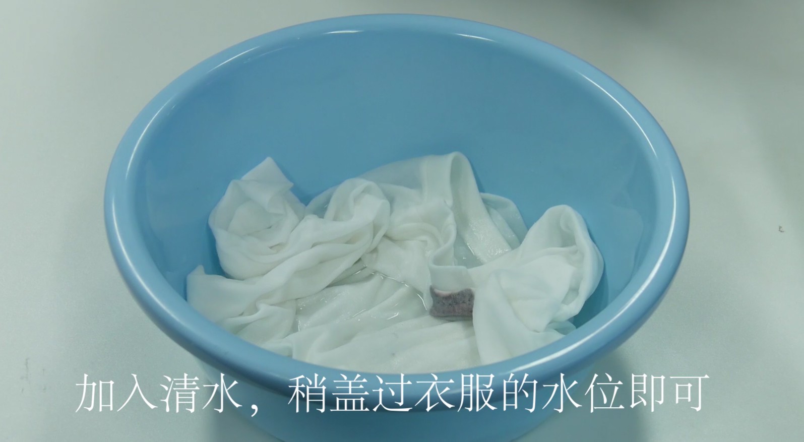用84消毒液洗衣服,首先在盆里加入清水,水位稍稍盖过衣服。