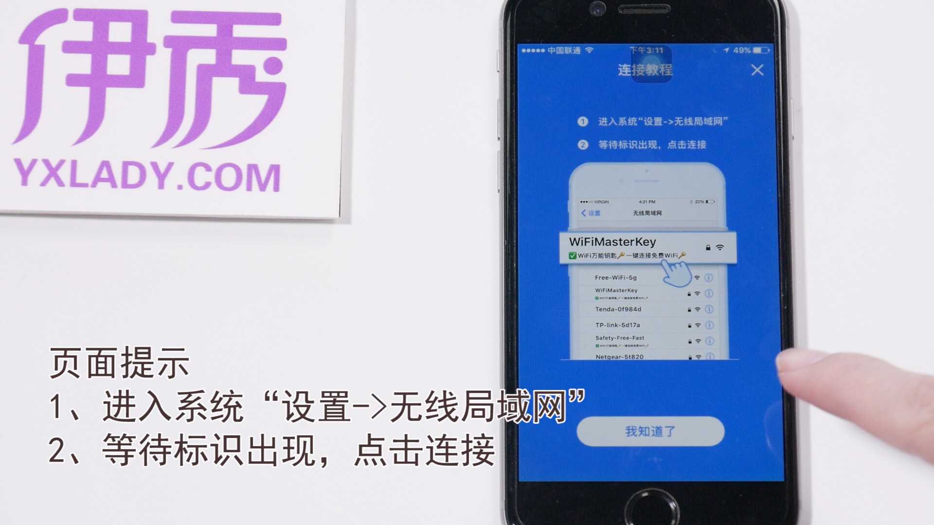 打开万能钥匙APP,点击【连接】,会显示可连接的WIFI,选择一个WIFI,会有页面提示你下一步操作,直接点击【我知道了】,点击手机桌面【设置】,点击【Wi-Fi】,选中一个带有“WiFi万能钥匙”的WiFi连接。