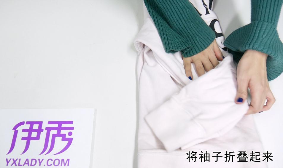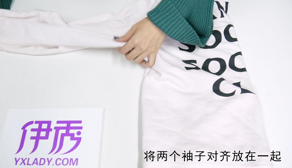 将衣服摊平,将两个袖子对齐放一起,抓好衣服缝线,将袖子折叠起来,最后将衣服叠起来就好了。