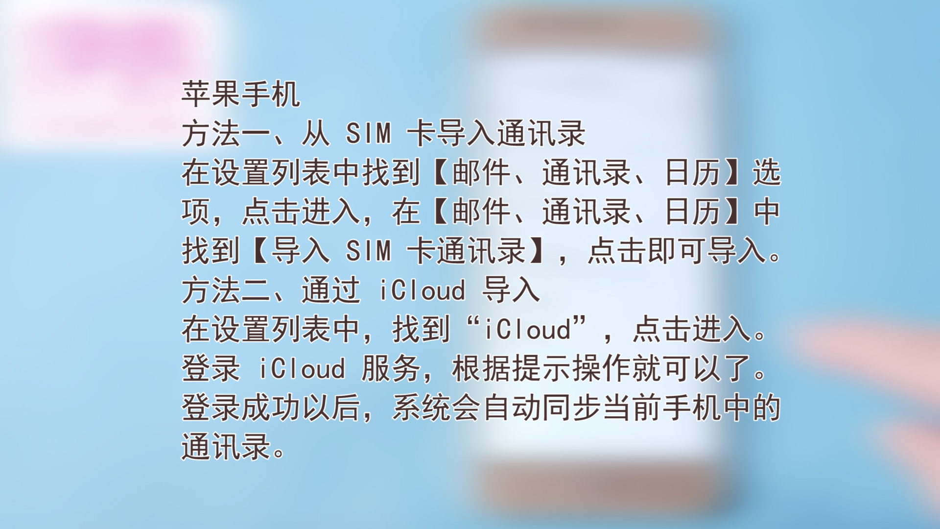苹果手机方法一、从 SIM 卡导入通讯录在设置列表中找到【邮件、通讯录、日历】选项,点击进入,在【邮件、通讯录、日历】中找到【导入 SIM 卡通讯录】,点击即可导入。方法二、通过 iCloud 导入在设置列表中,找到“iCloud”,点击进入。登录 iCloud 服务,根据提示操作就可以了。登录成功以后,系统会自动同步当前手机中的通讯录。
