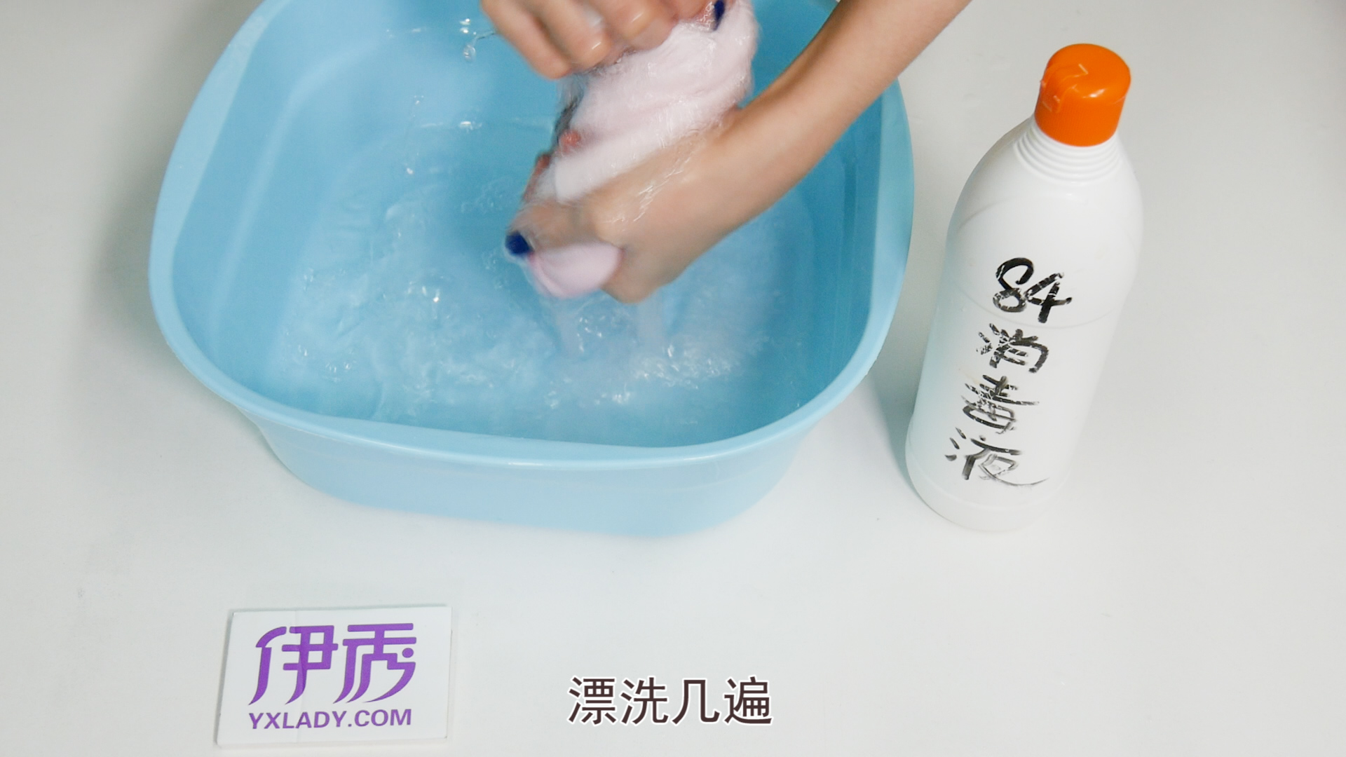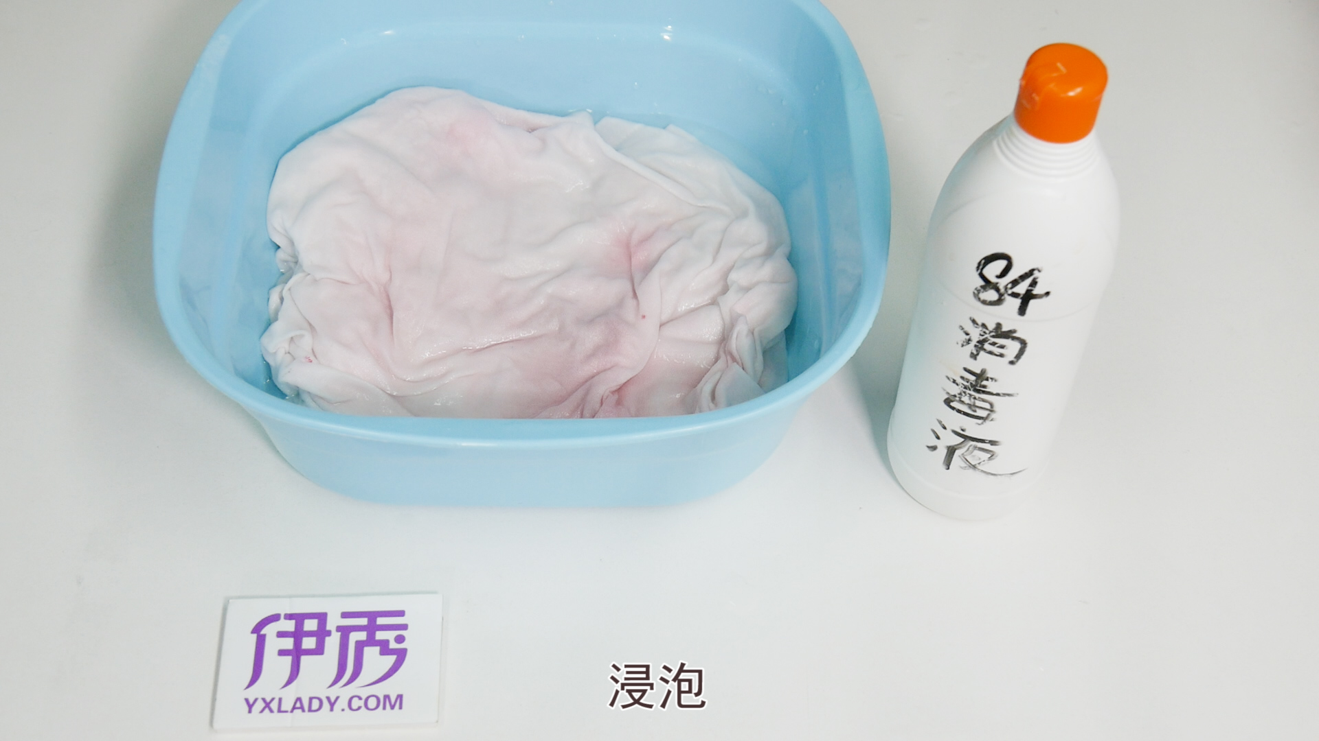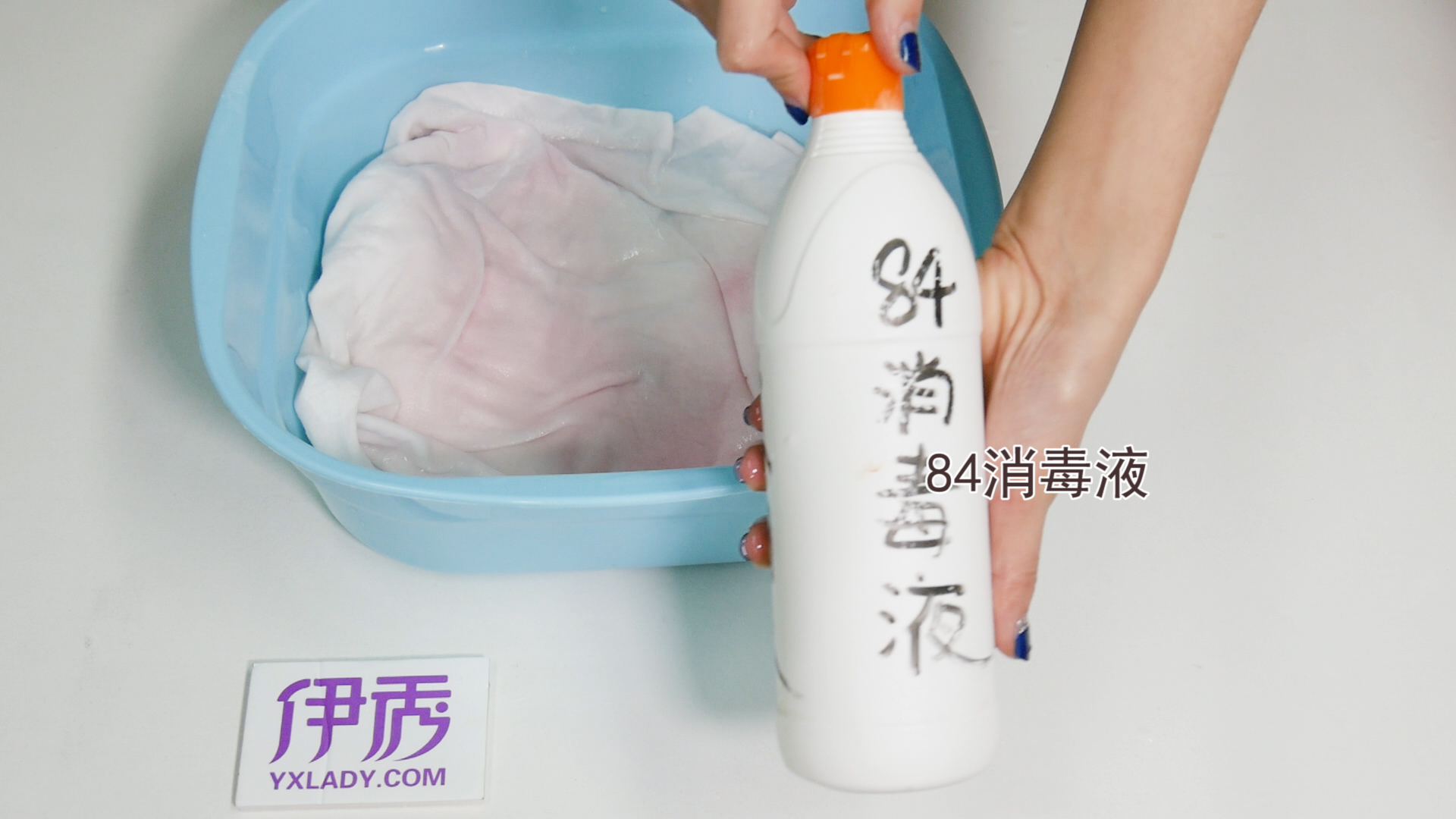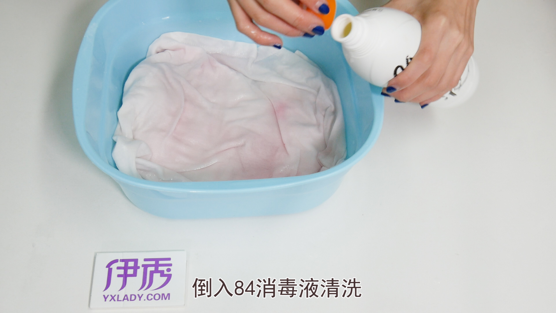 把被染色的衣服放入清水中泡泡,准备一瓶消毒液,倒入84消毒液清洗,浸泡半个钟,漂洗几遍,白衣服焕然如新。