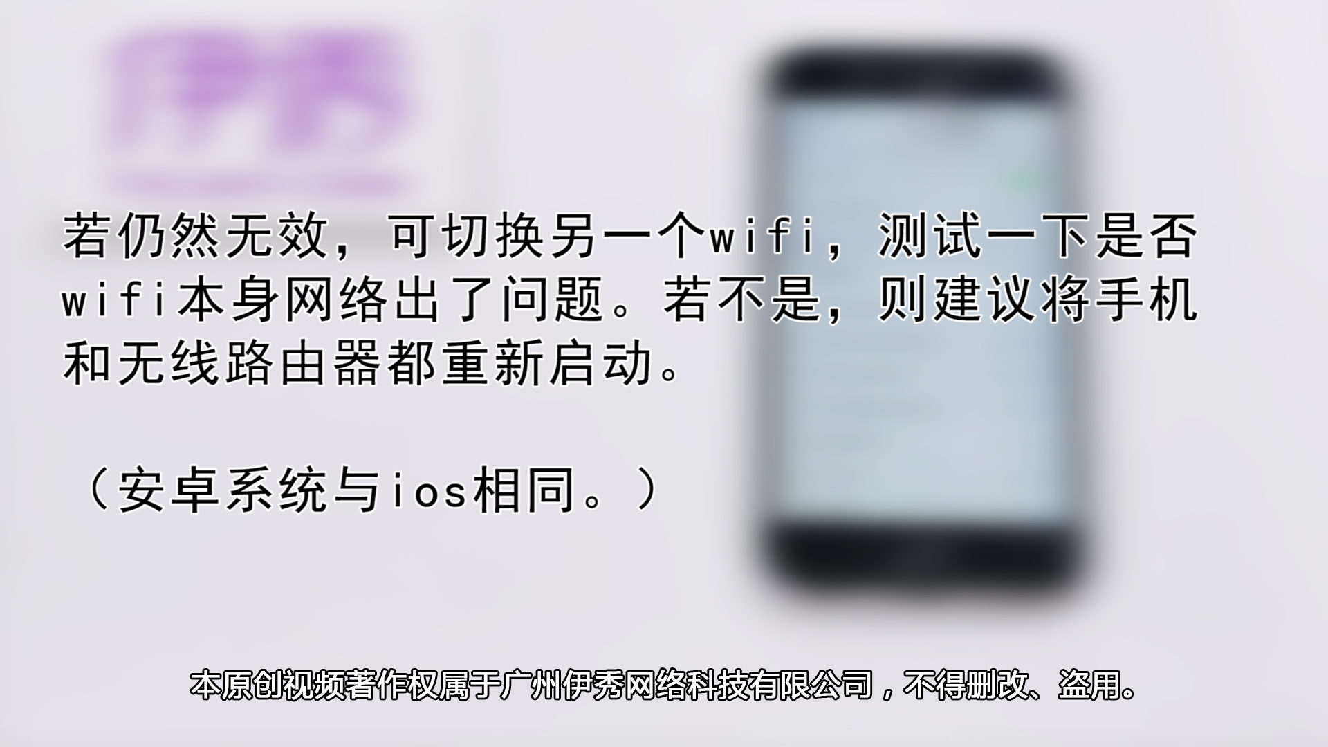 若仍无效,可切换另一个WiFi,测试一下是否是WiFi本身网络出了问题。若不是,则建议将手机和无线路由器都重新启动。(安卓系统与iOS相同)