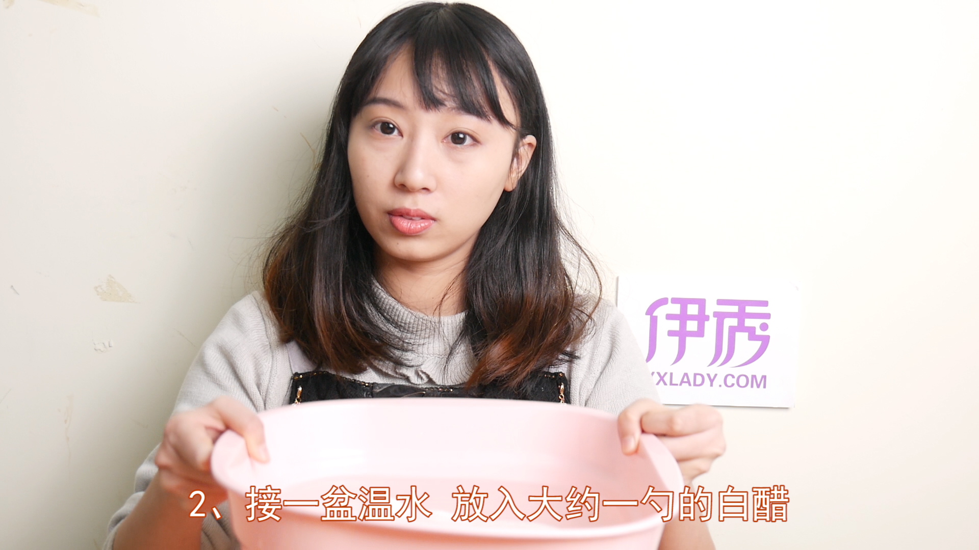 2.接一盆温水,放入大约一勺的白醋。