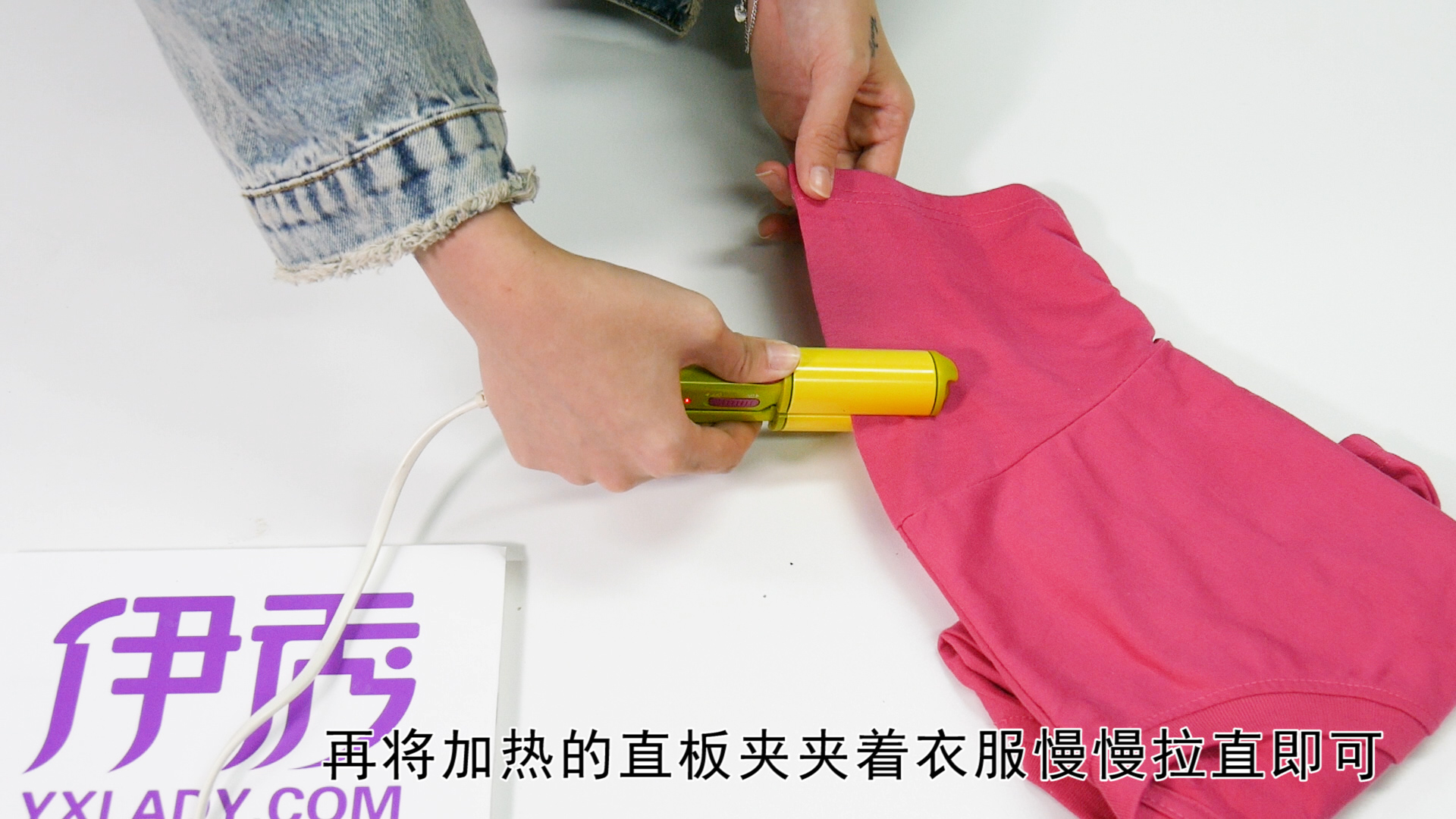 将需要熨的衣服铺平摊开,将热了的直板夹夹住衣服,慢慢拉直即可熨平衣服褶皱。