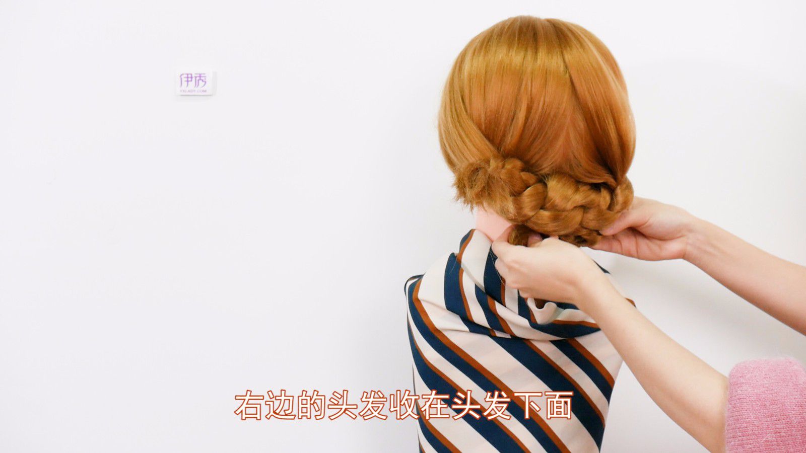 右边的头发收在头发下面。
