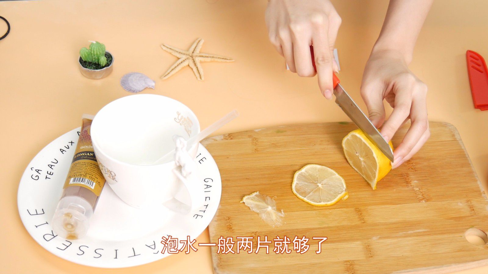 用刀将柠檬切成片状,泡水一般两片就够了,将柠檬籽去掉,柠檬片放入水杯中,加入适量的蜂蜜,倒入温开水,用吸管搅拌一下即可饮用。