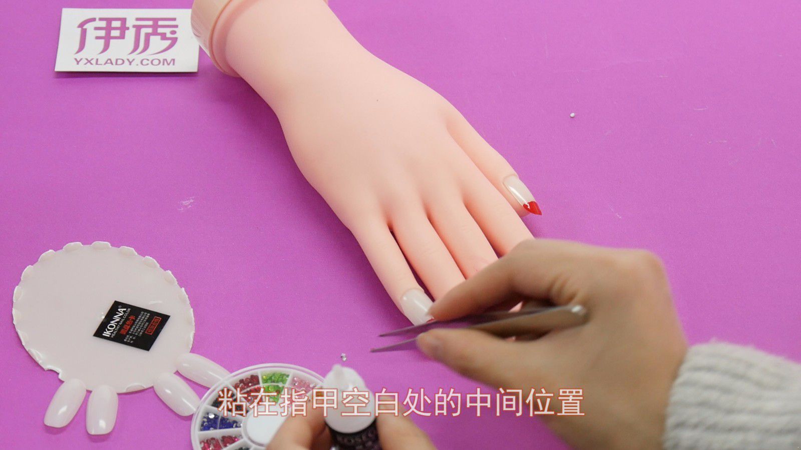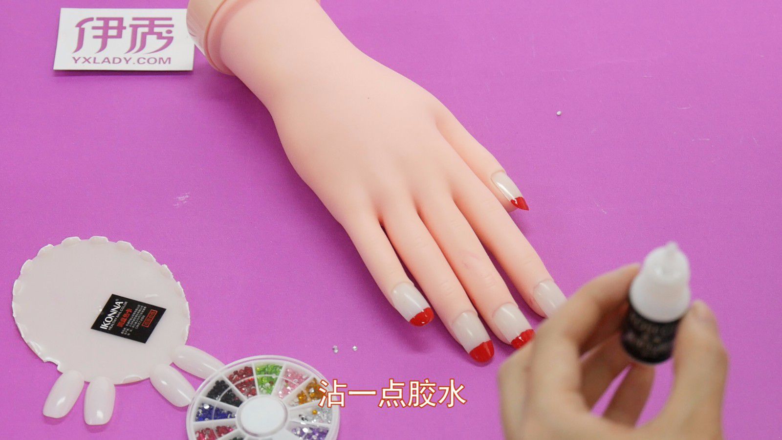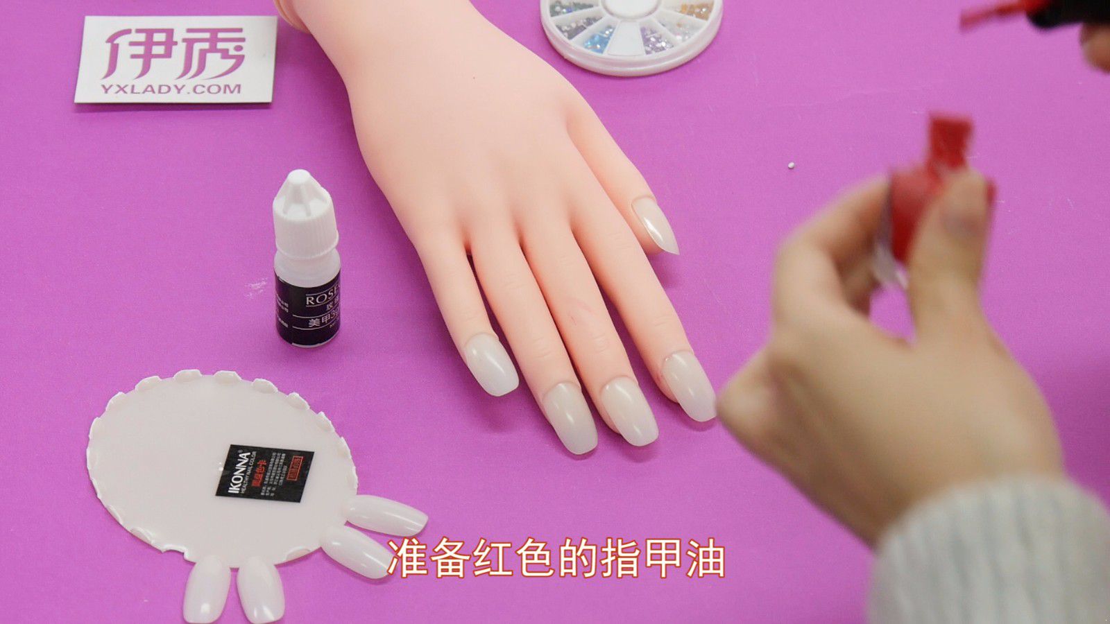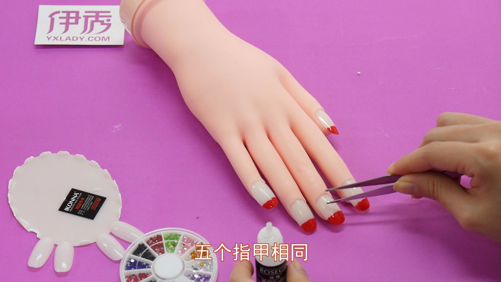 准备红色的指甲油,将指甲油涂抹在指甲尖的位置,涂抹的时候注意上面尽量要平一点,五个指甲涂抹方式相同,涂抹好之后等红色甲油干,用小镊子夹住白色的闪钻,沾一点胶水,粘在指甲空白处的中间位置,五个指甲相同,粘好即可。