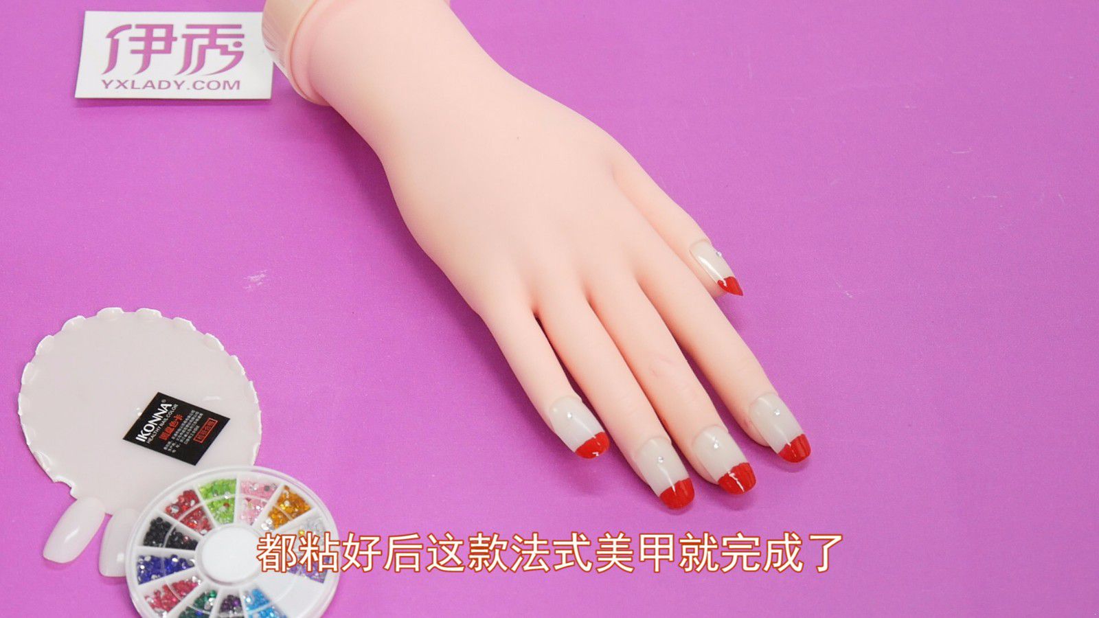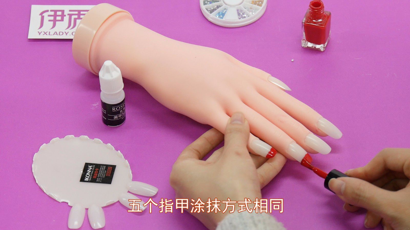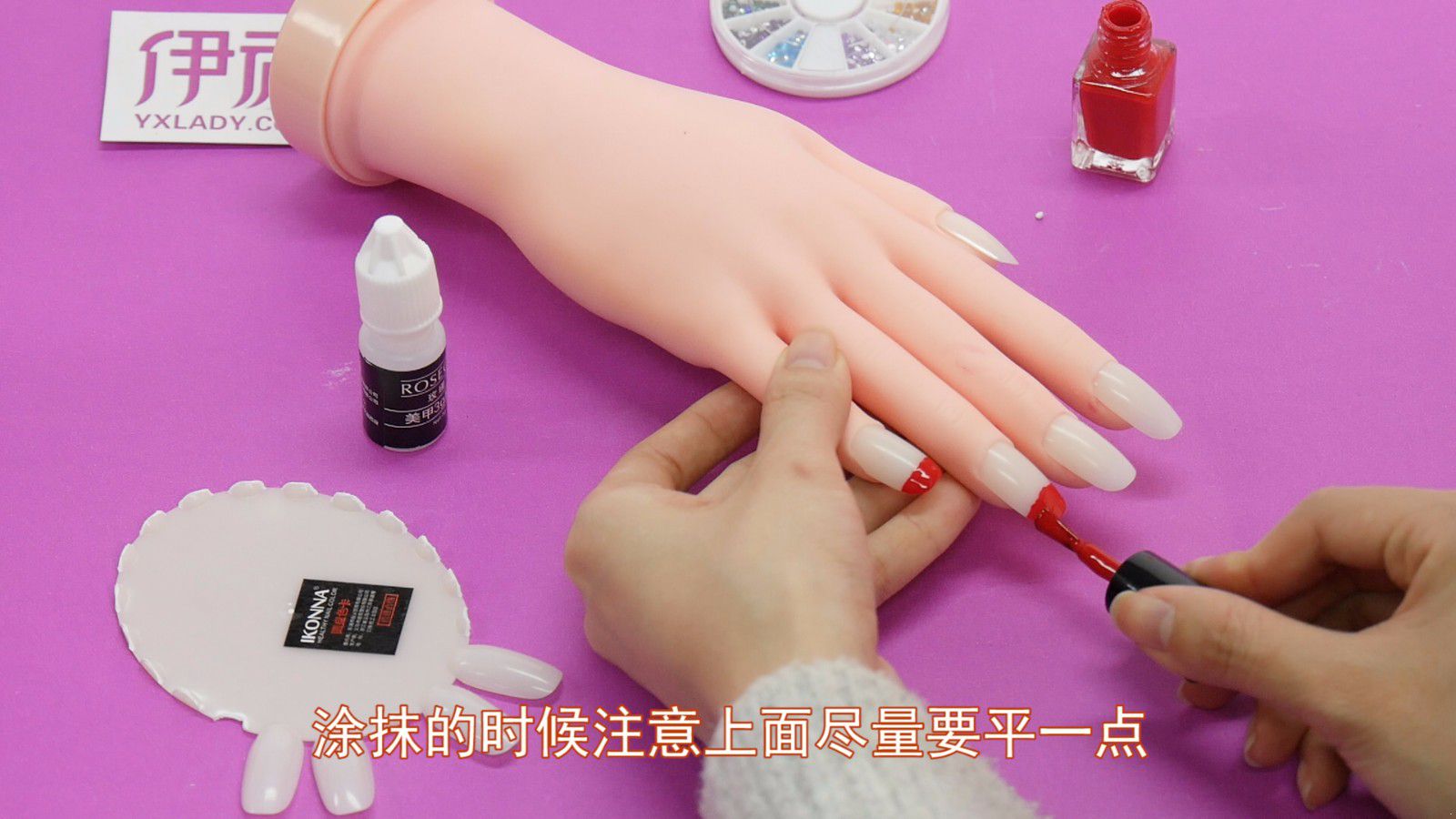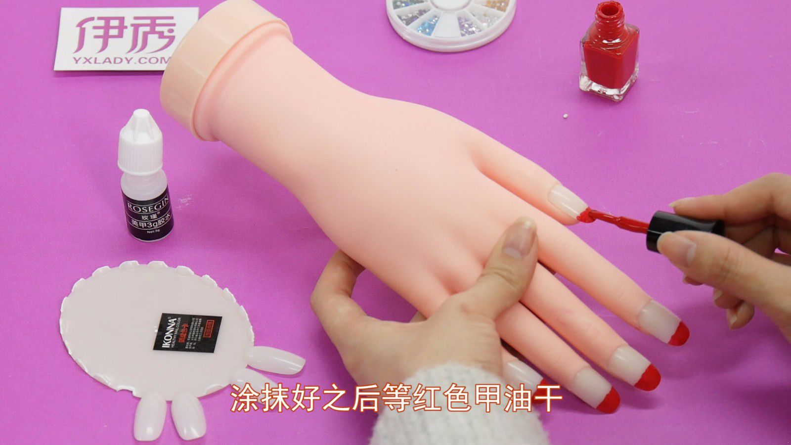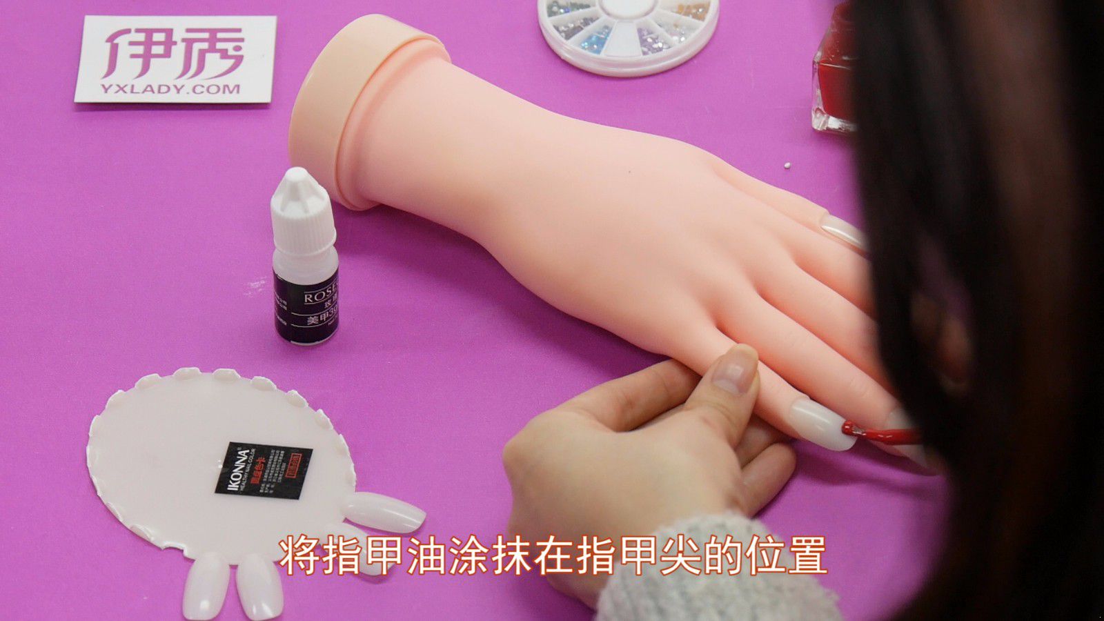 准备红色的指甲油,将指甲油涂抹在指甲尖的位置,涂抹的时候注意上面尽量要平一点,五个指甲涂抹方式相同,涂抹好之后等红色甲油干,用小镊子夹住白色的闪钻,沾一点胶水,粘在指甲空白处的中间位置,五个指甲相同,粘好即可。