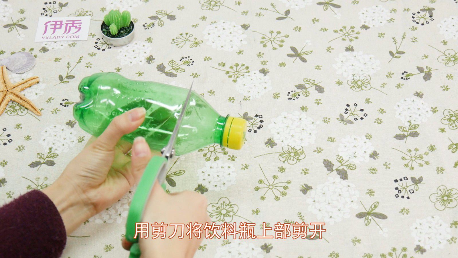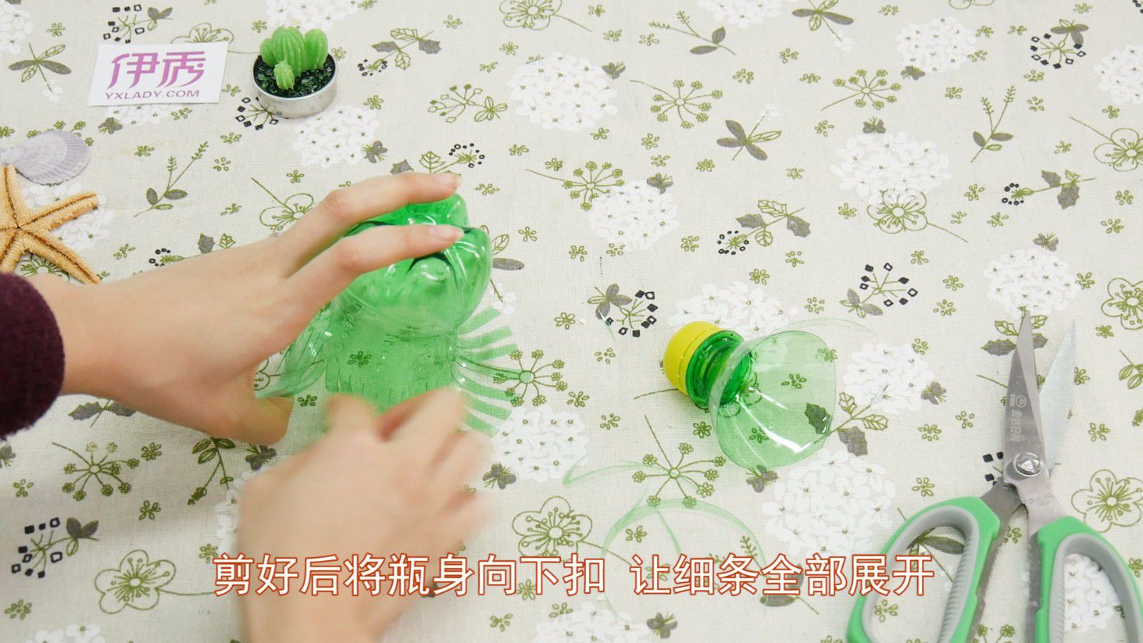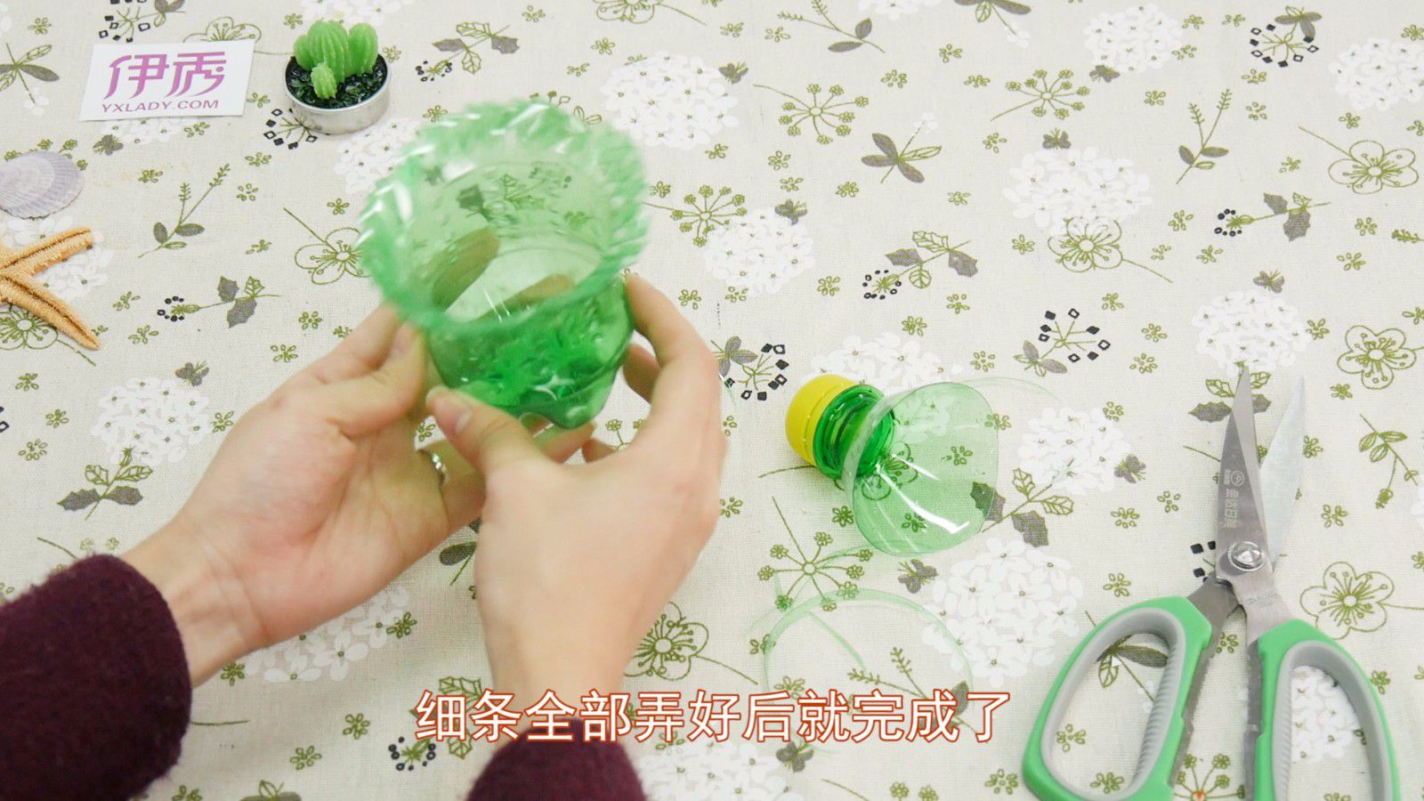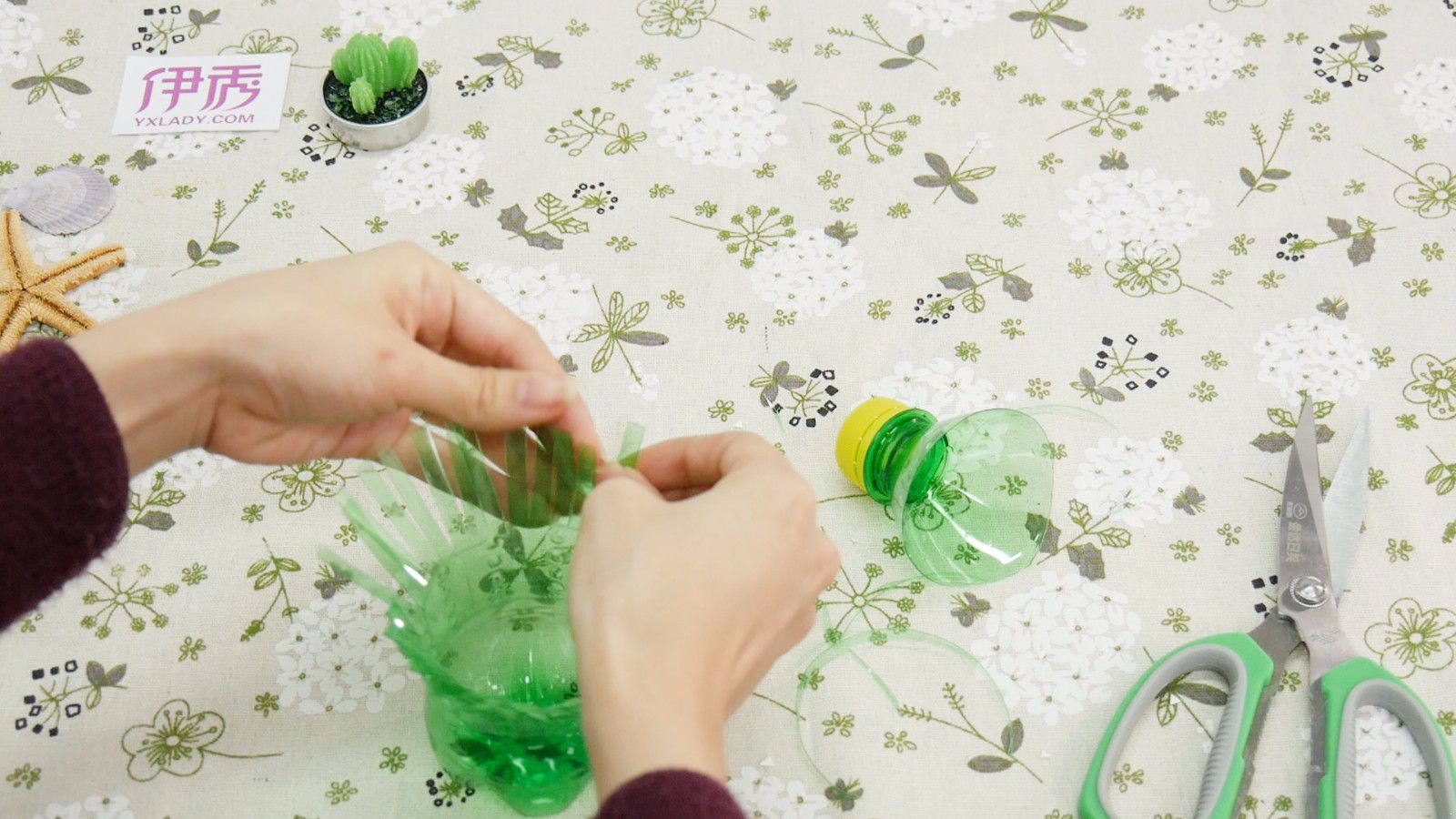 准备一个饮料塑料瓶,用剪刀将饮料瓶上部剪开,留下下部分,用剪刀竖着剪出竖条形状,全部按照相同宽度剪好,剪好后将瓶身向下扣,让细条全部展开,开始编花,如视频所示方法,细条全部弄好后就完成了。