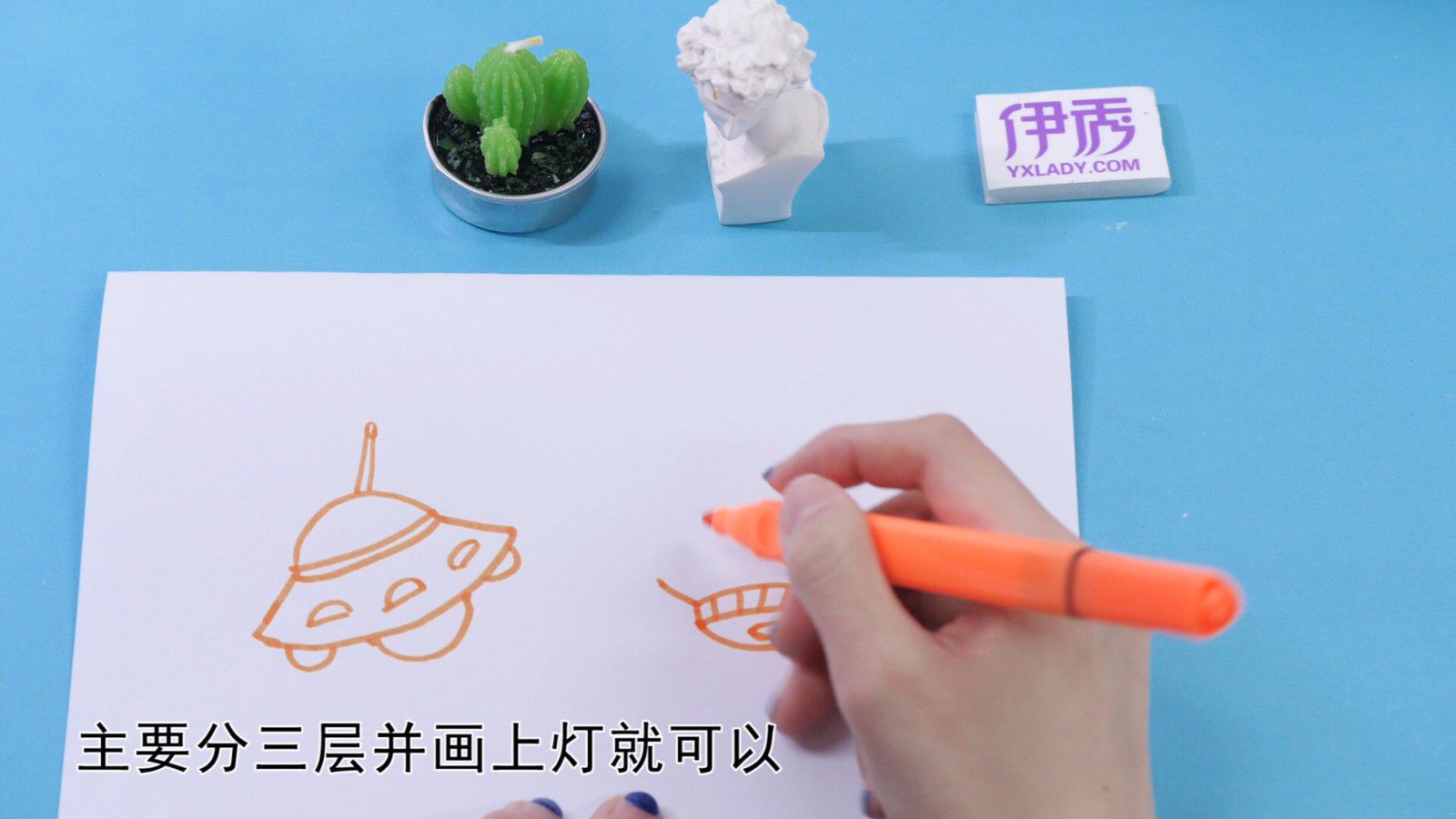 首先画一个半圆,接着画上半扇形,底部加上小半圆,并适当装饰就可以了。简笔画宇宙飞船可以发挥想象,主要分三层并画上灯就可以。