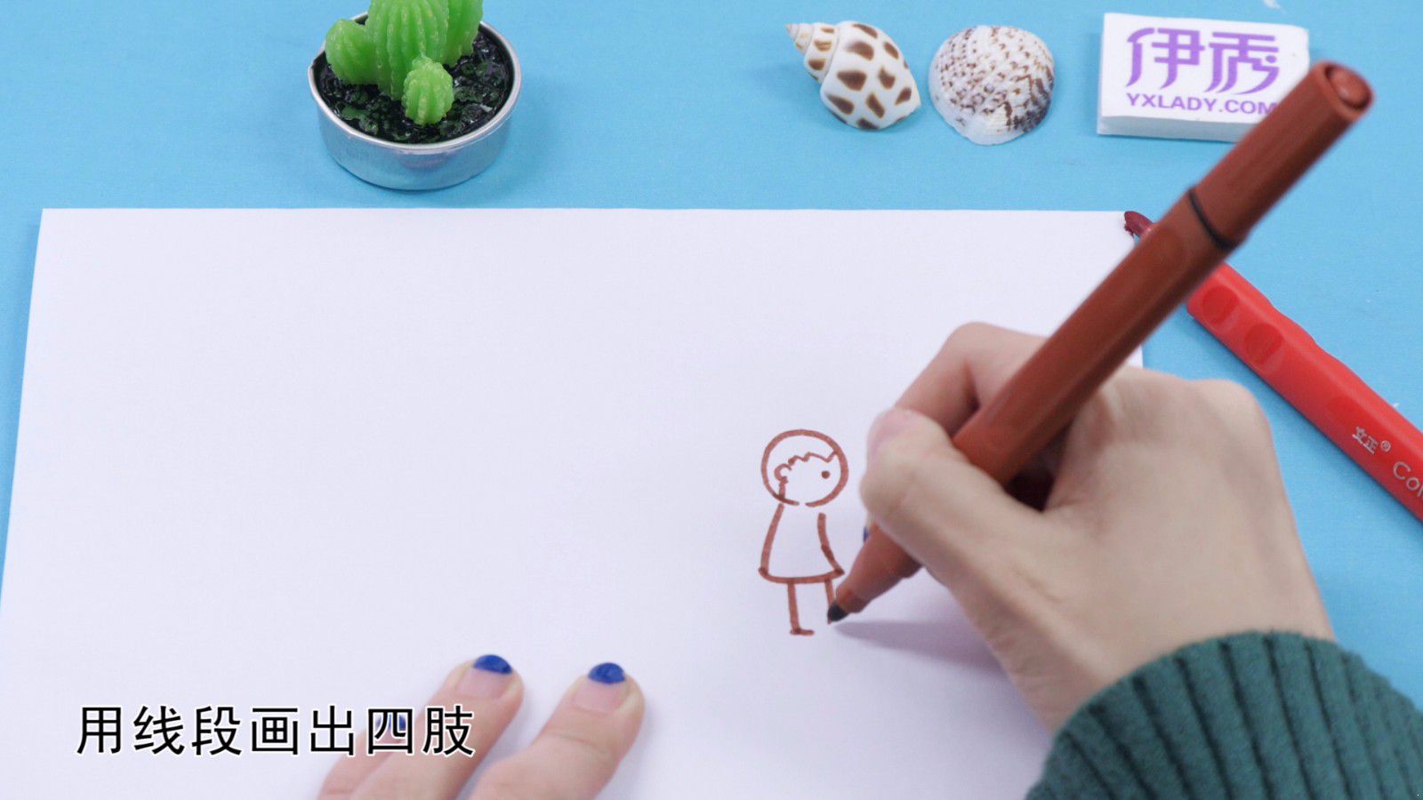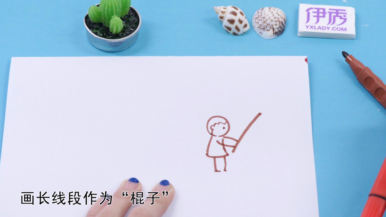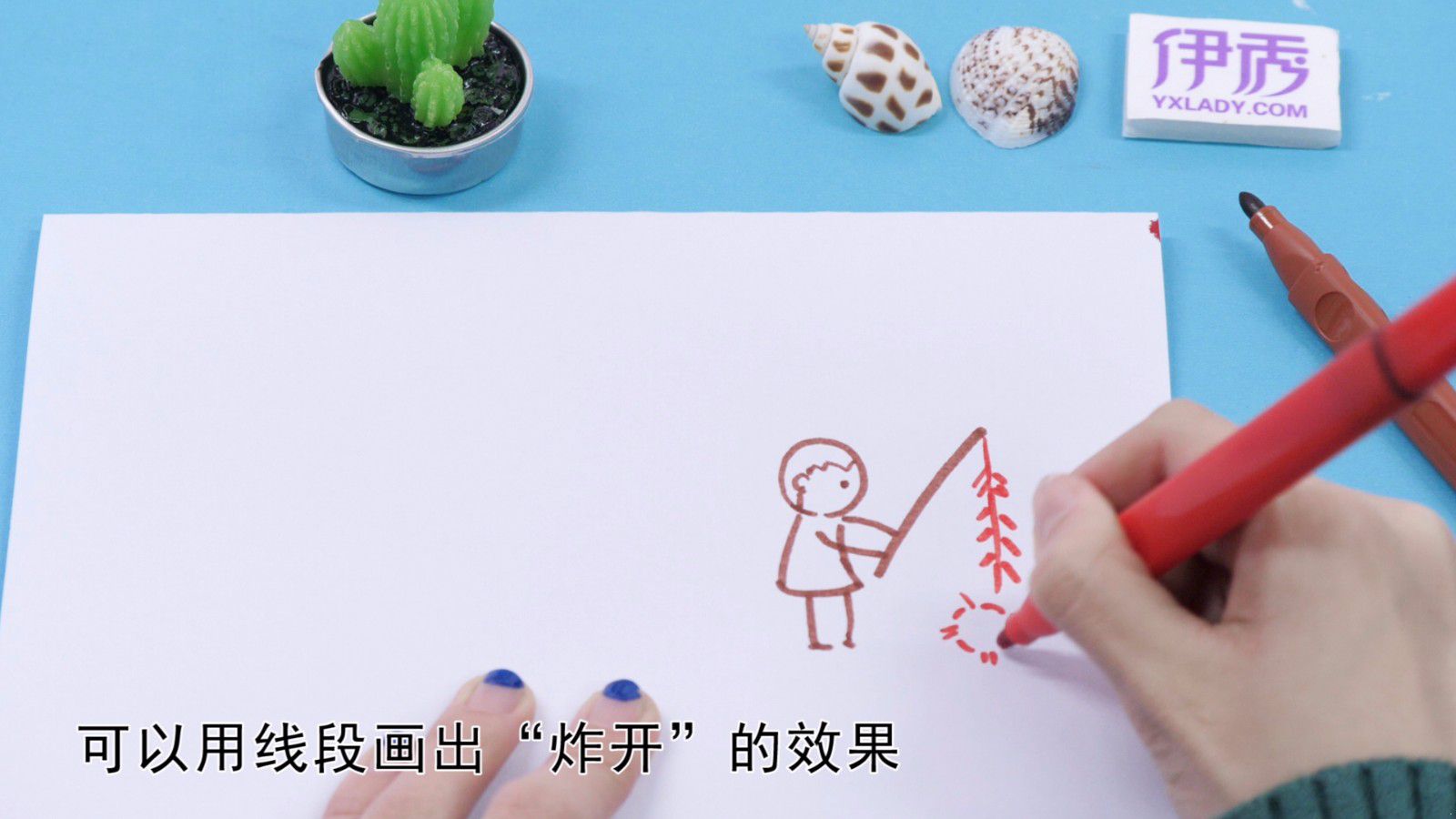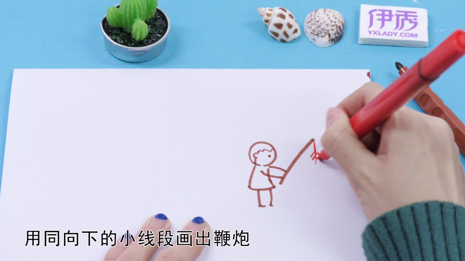 首先画出小孩的样子,折线画出头发,画侧面可以只点出一边的眼睛,接着画出身体,用线段画出四肢,画长线段作为棍子,用同向下的小线段画出鞭炮,可以用线段画出炸开的效果。