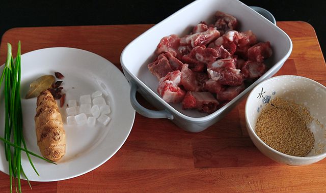 食材准备:排骨,姜,小葱,冰糖,八角(大料),桂皮,香叶,炒熟白芝麻(可省)。