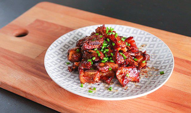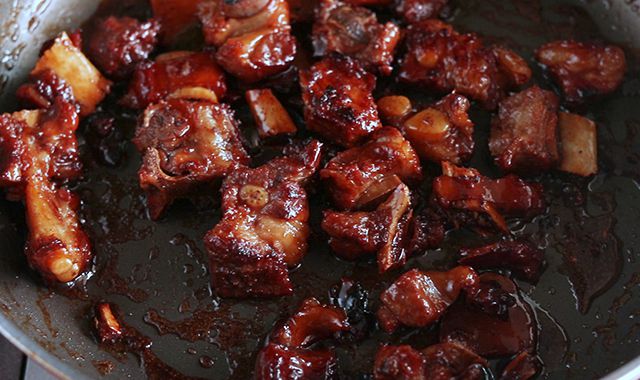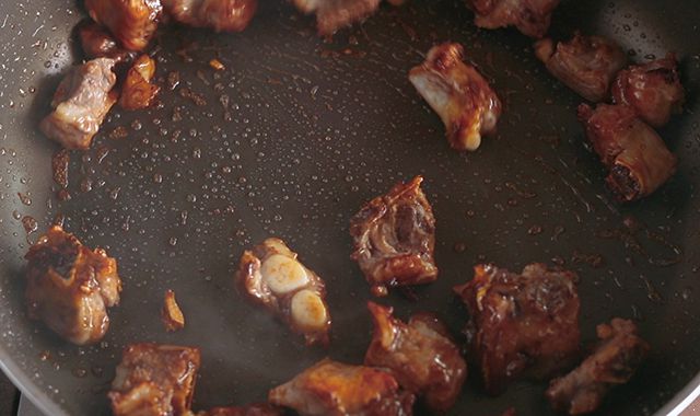 还剩一点汁液时打开盖子,继续翻炒,直到最后的汁液全部收干。