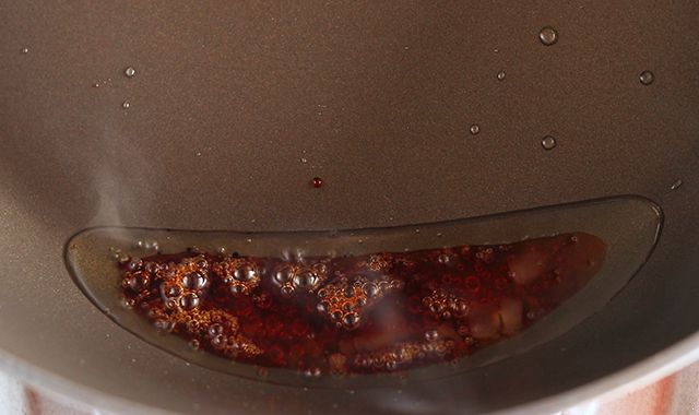 锅中热油,下冰糖,中小火,让冰糖在热油中融化。
