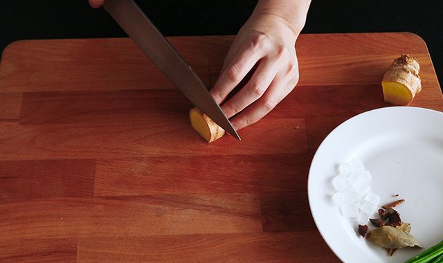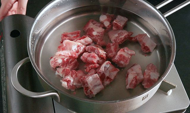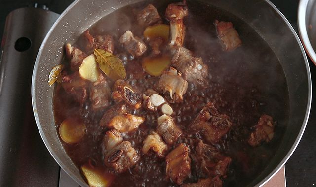 倒入没过排骨的清水,加入姜片和其他香料,加入生抽和盐调味,大火煮沸后盖上盖子,转小火焖煮60分钟。
