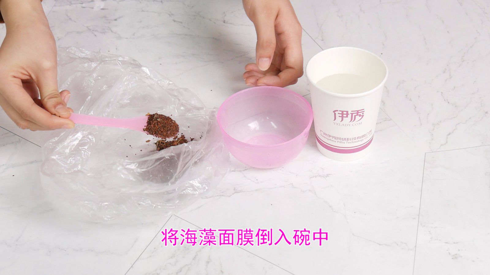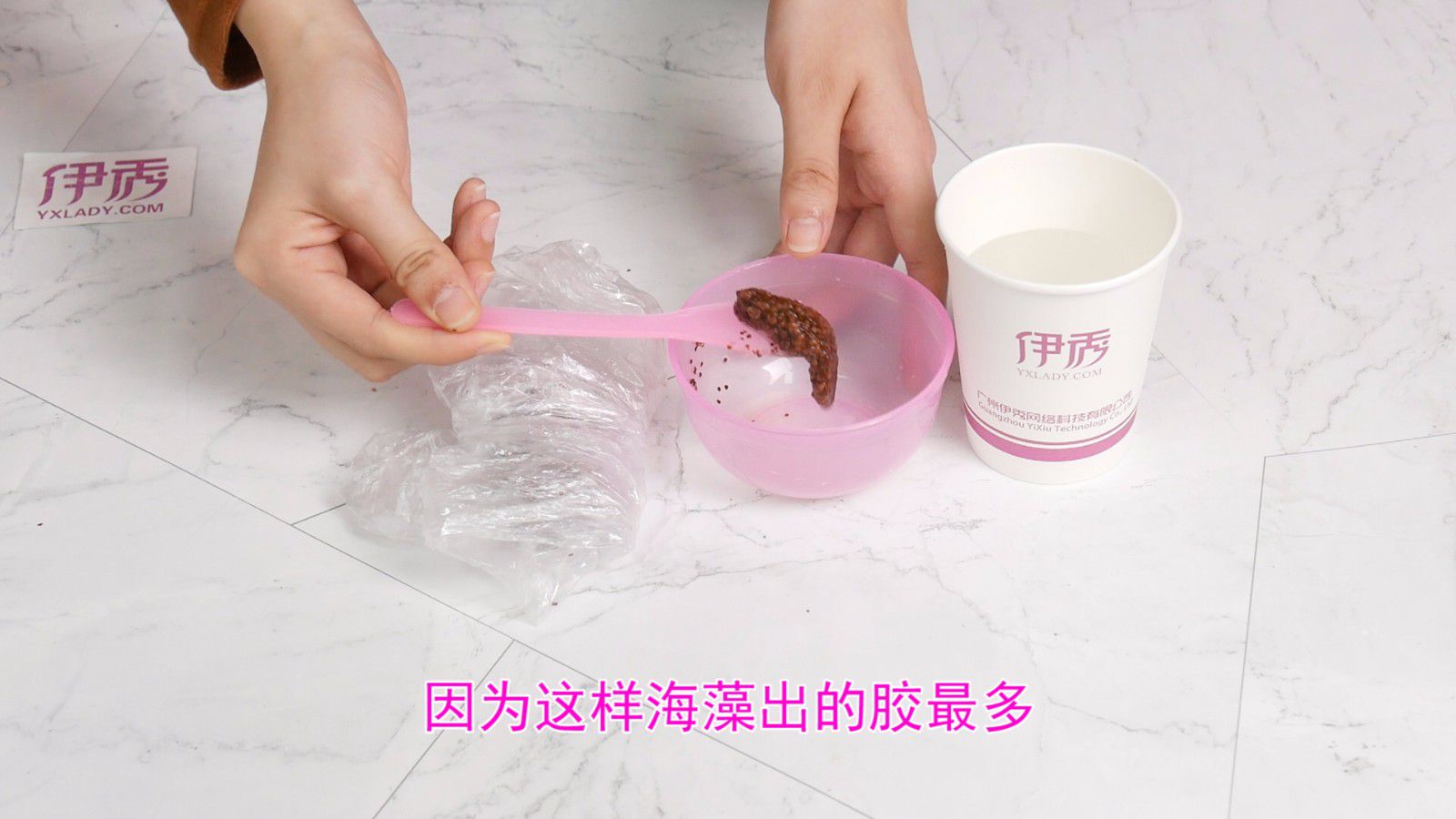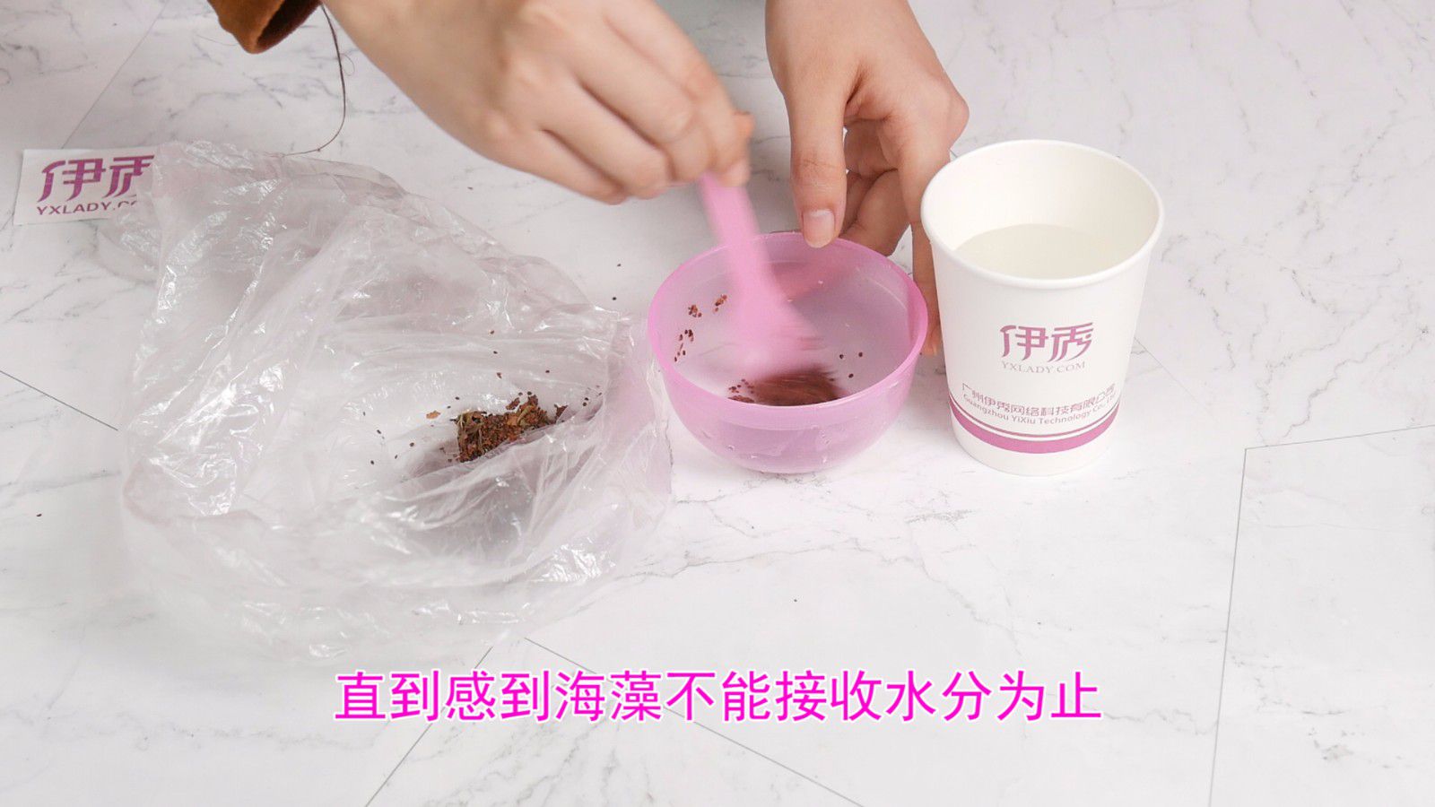 缓缓加水渐渐用面膜棒搅拌,直到感到海藻不能接收水分为止。