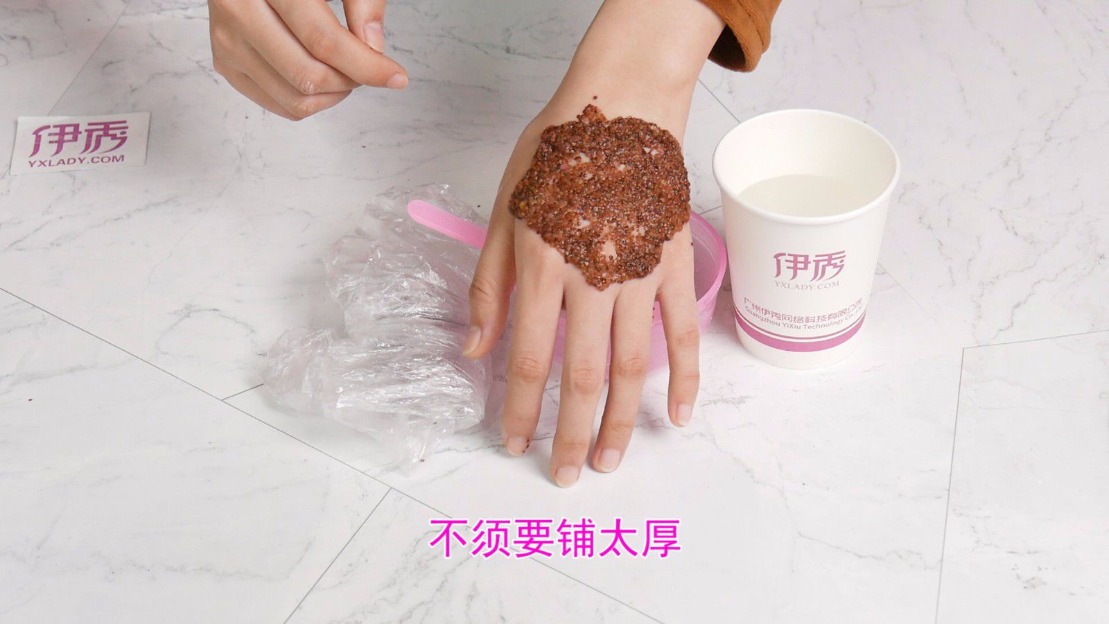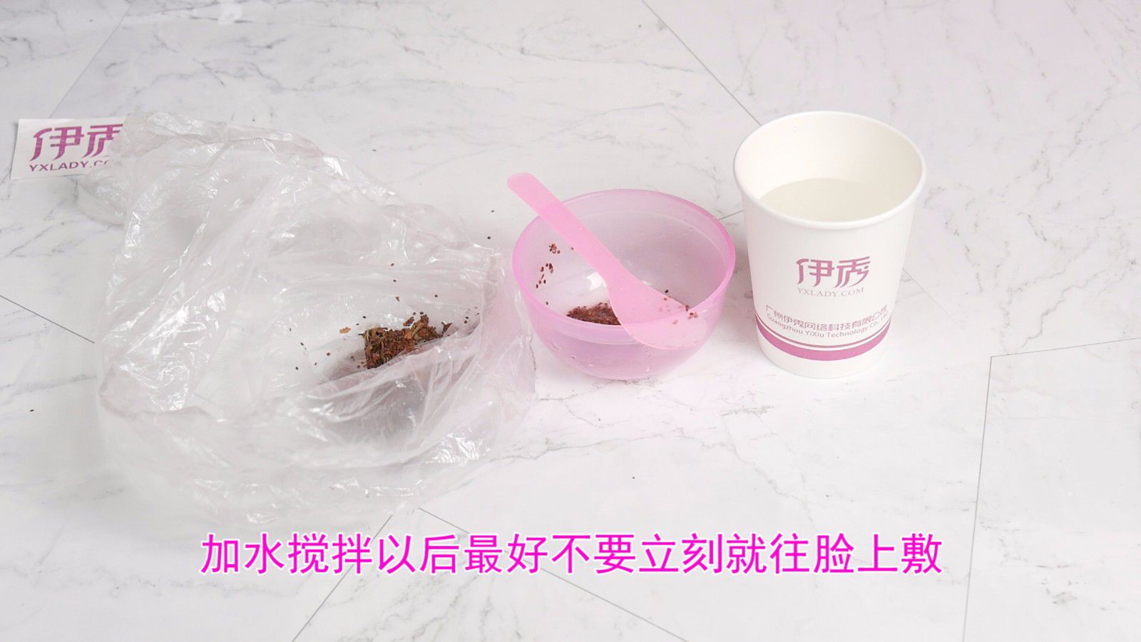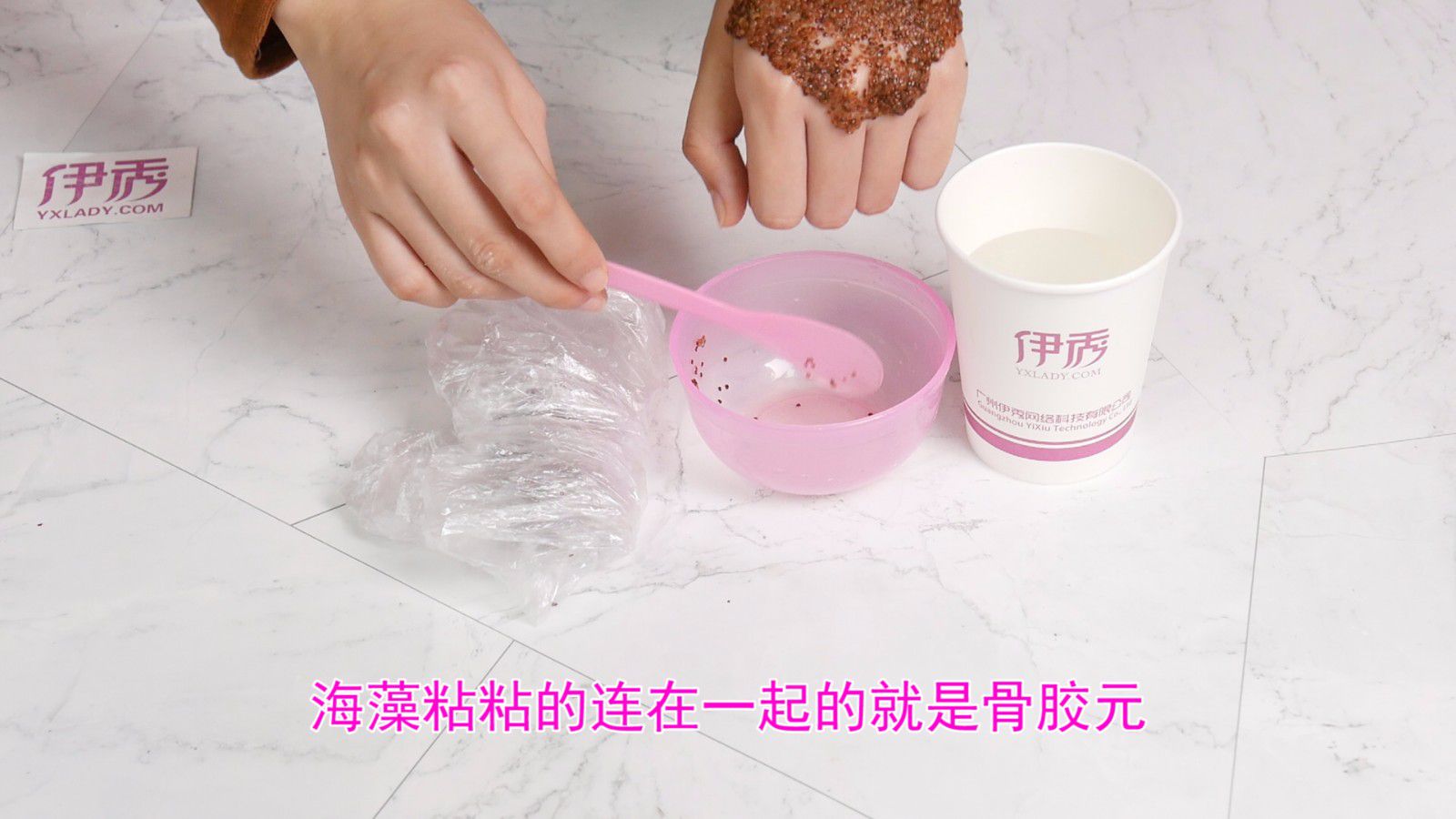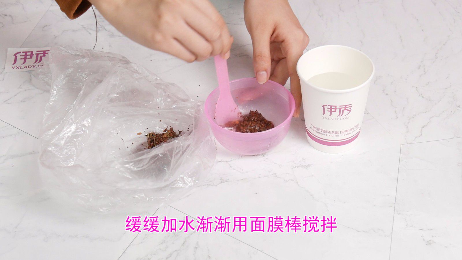 缓缓加水渐渐用面膜棒搅拌,直到感到海藻不能接收水分为止。