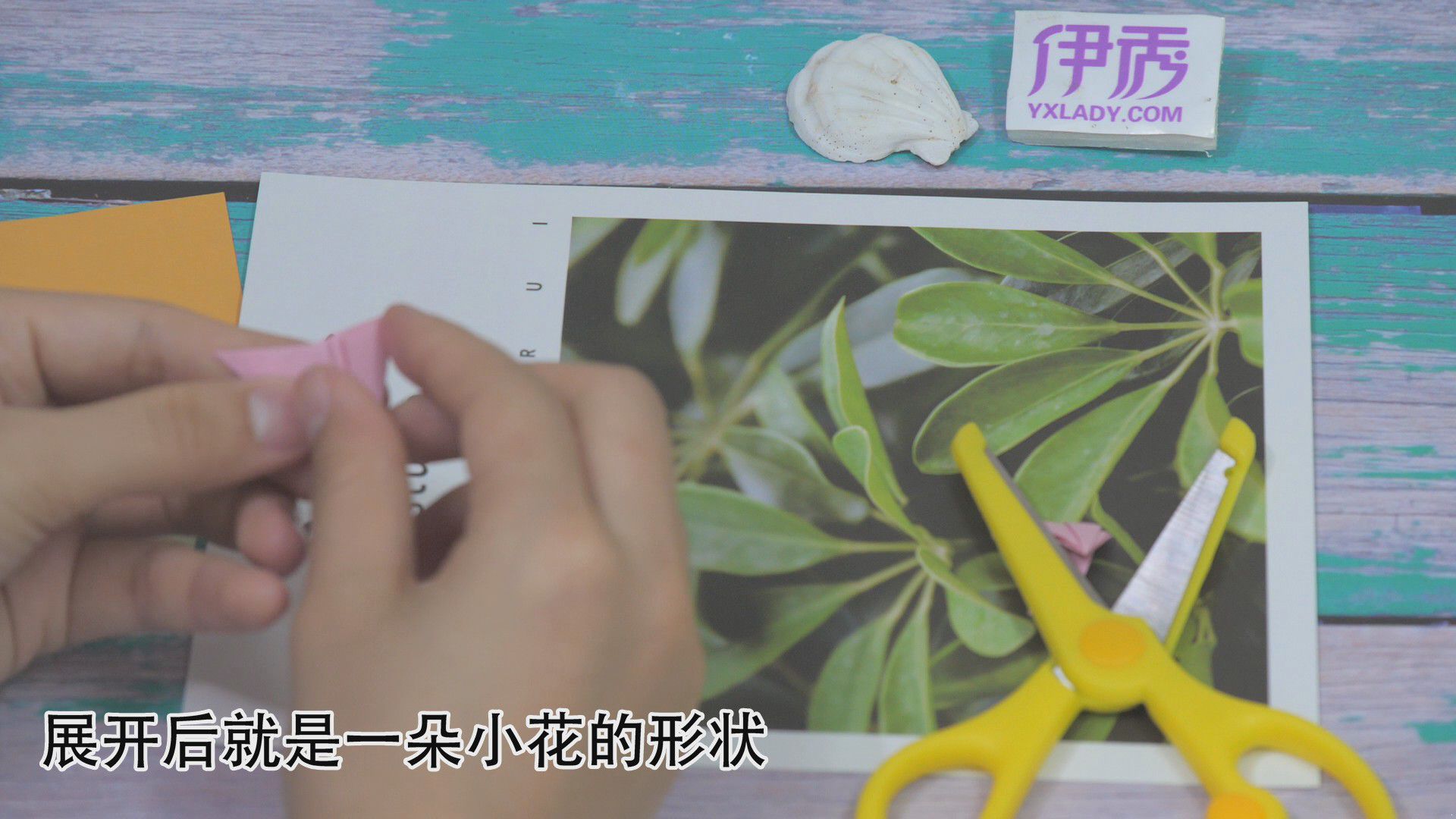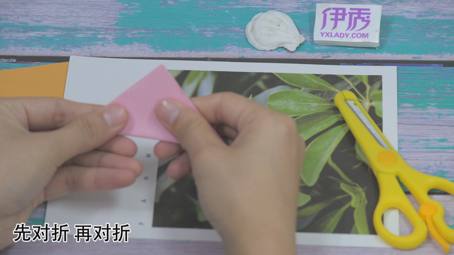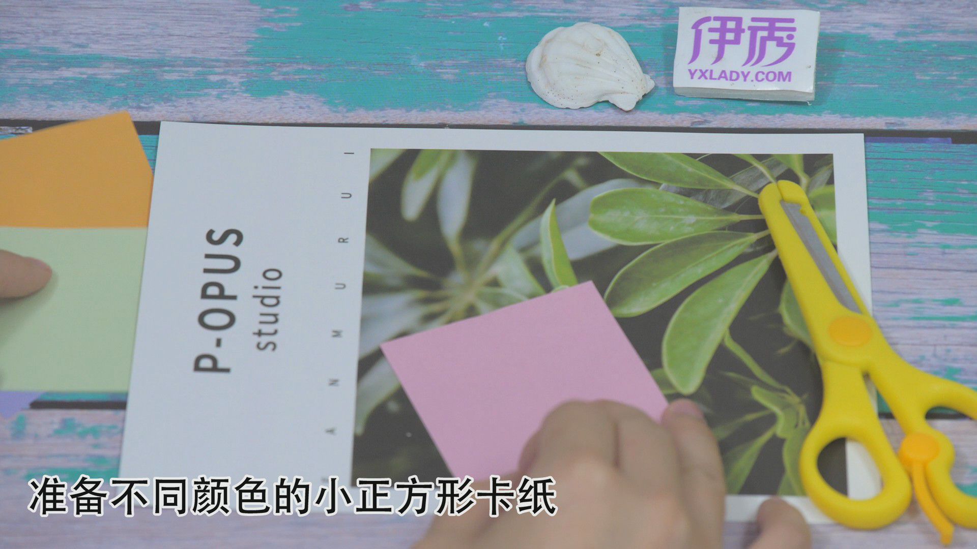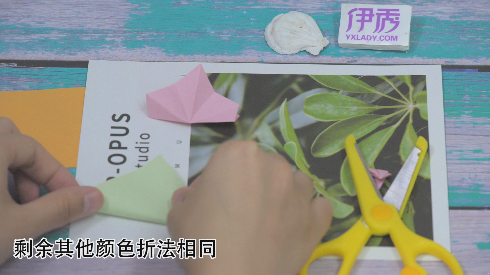 准备不同颜色的小正方形卡纸,每一张折法相同。