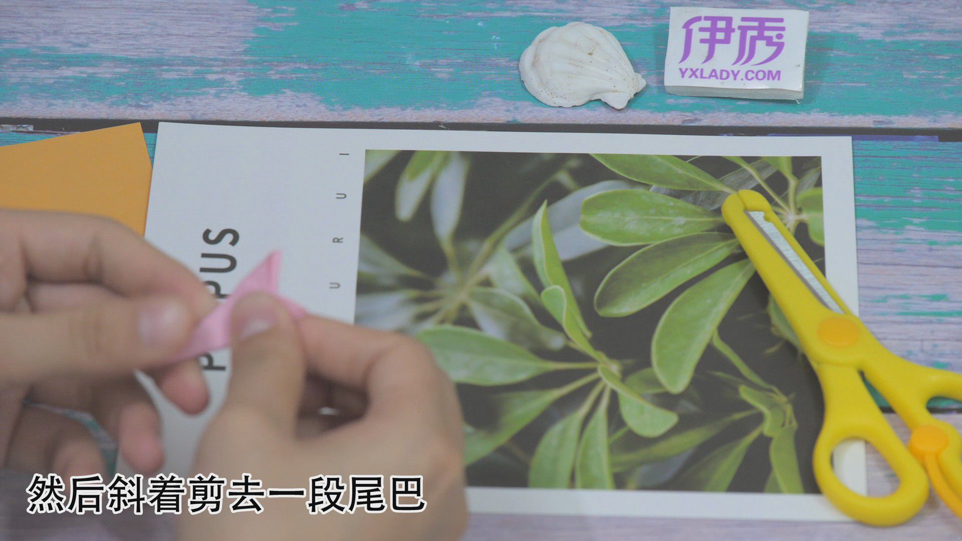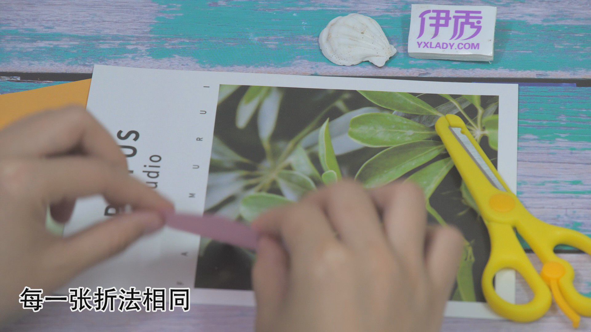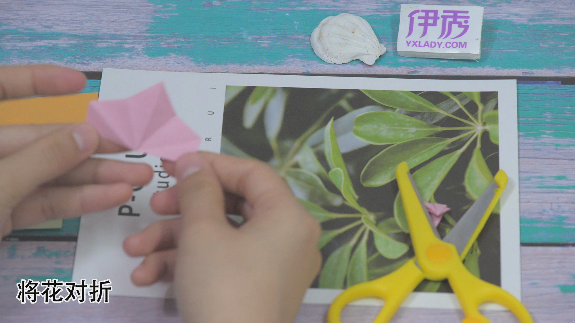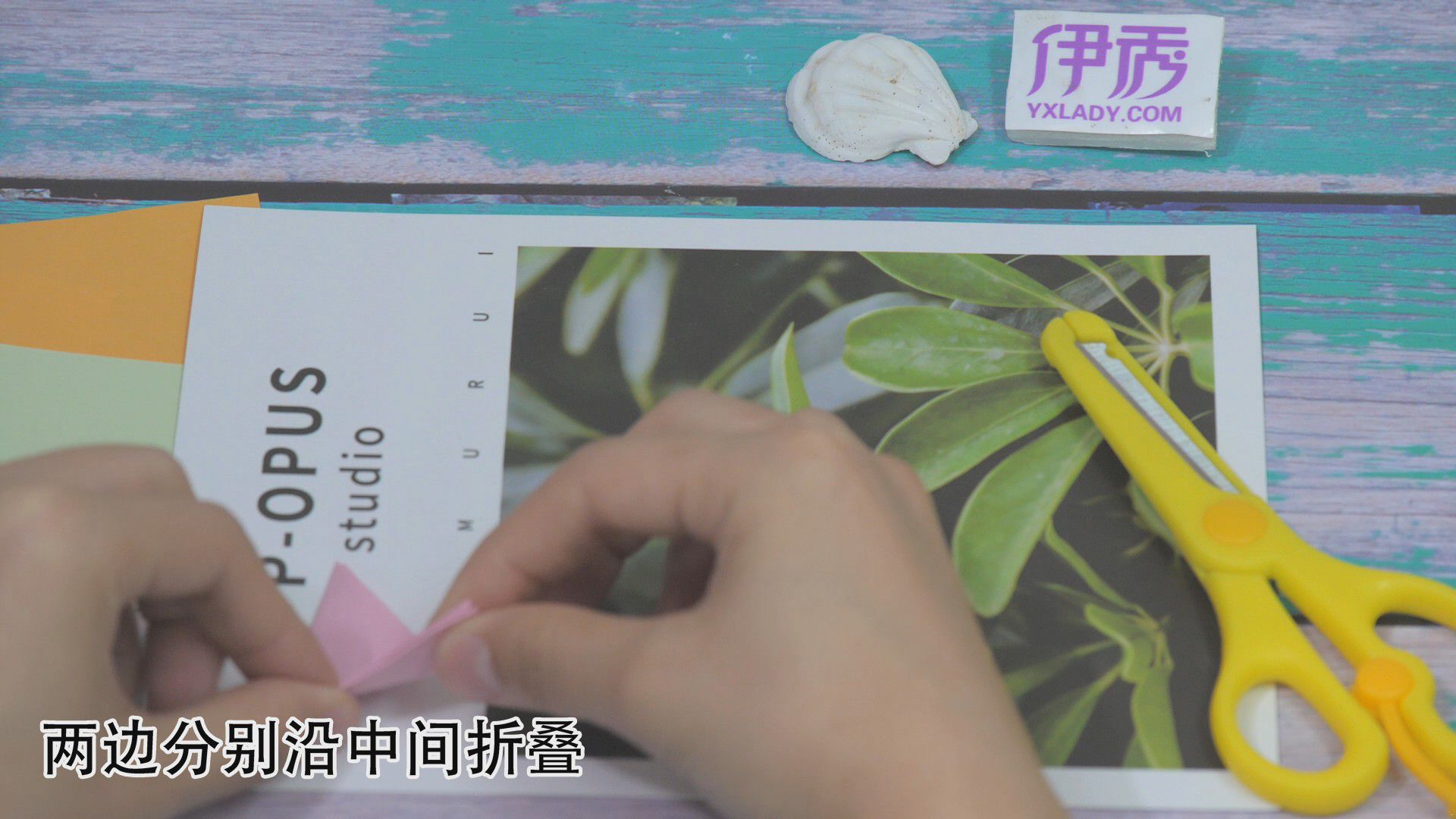 准备不同颜色的小正方形卡纸,每一张折法相同。
