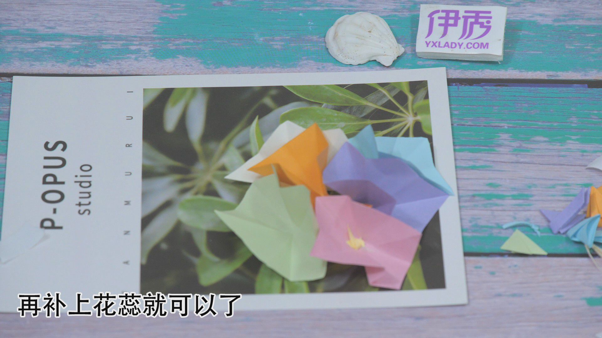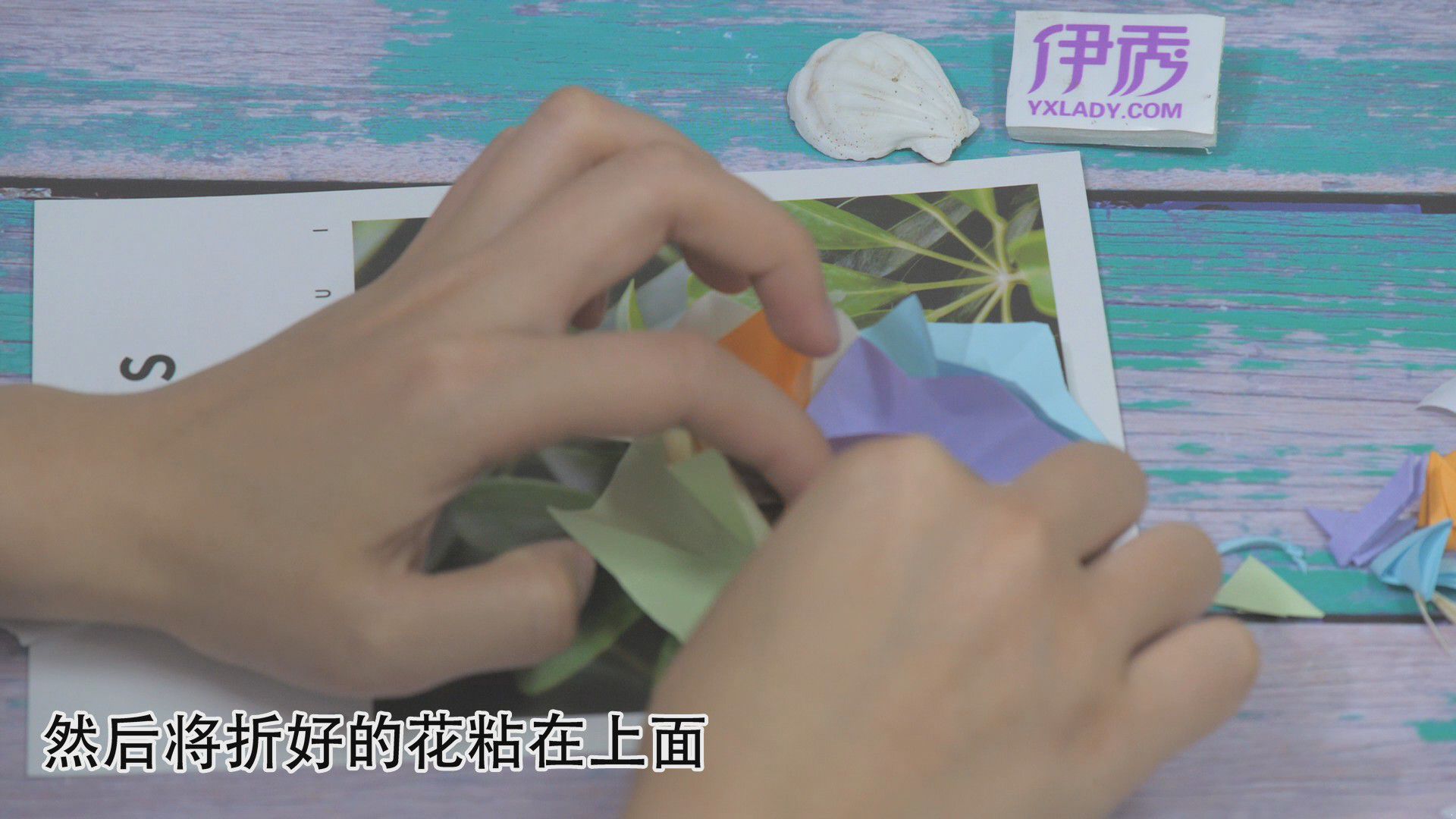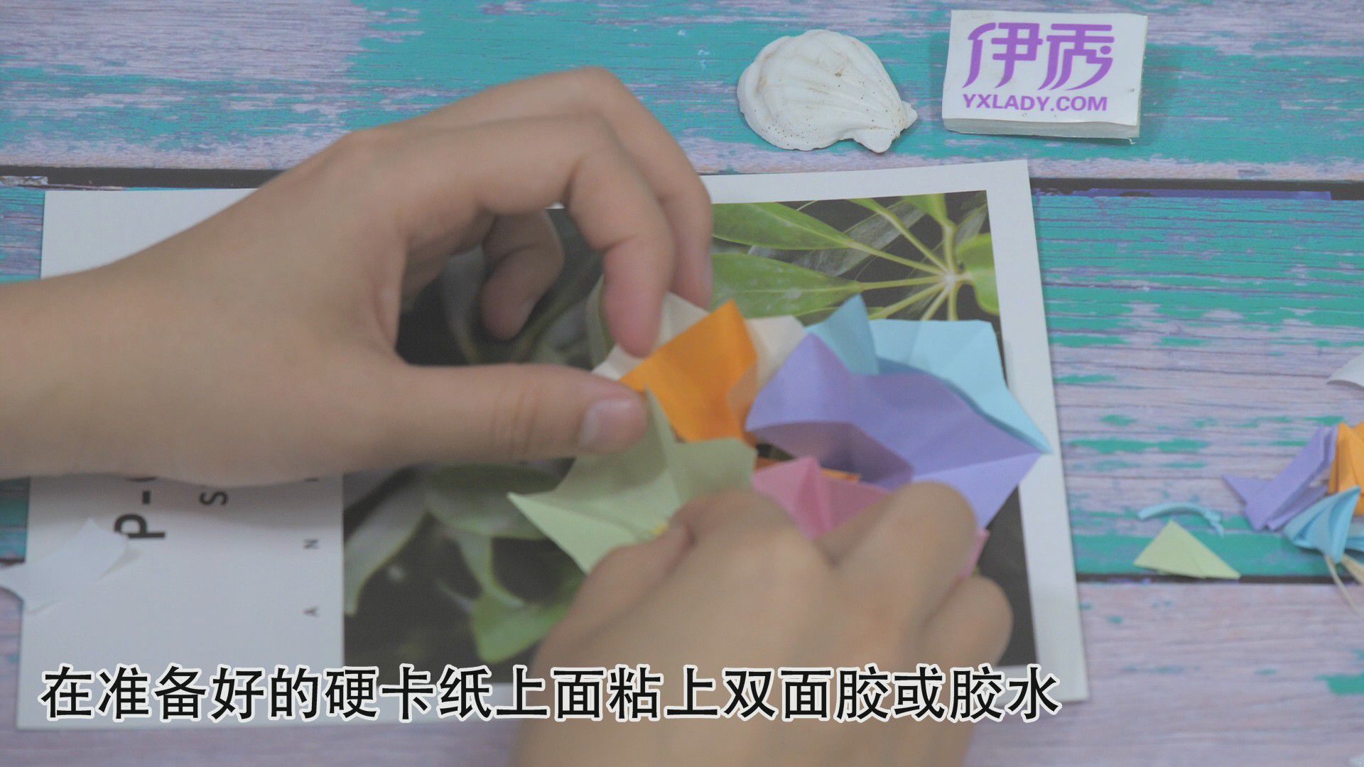 全部折好后在准备好的硬卡纸上面粘上双面胶或胶水,然后将折好的花粘在上面,再补上花蕊就可以了。