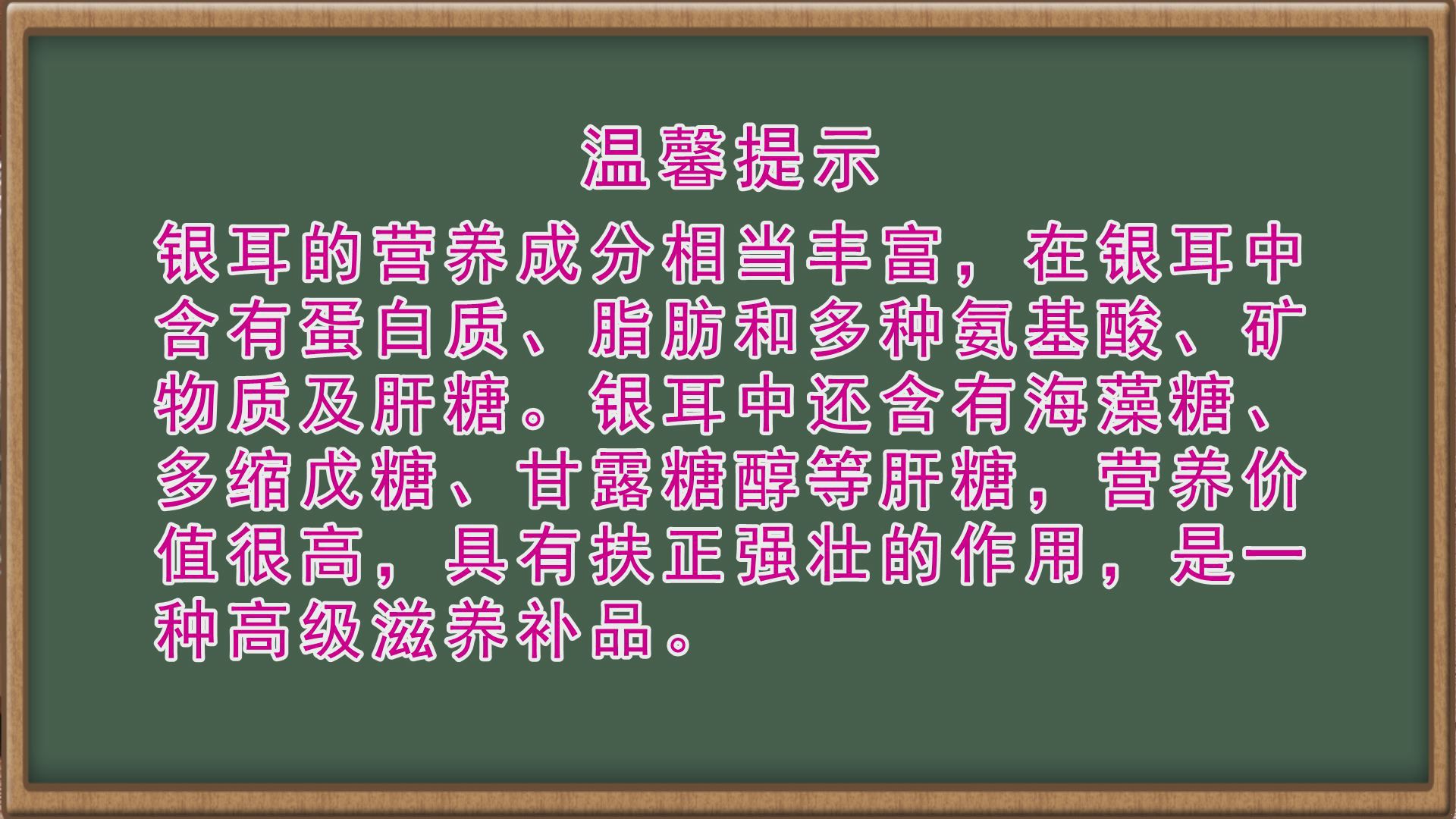 温馨提示:银耳的营养成分相当丰富,在银耳中含有蛋白质、脂肪和多种氨基酸、矿物质及肝糖。银耳中还含有海藻糖、多缩戊糖、甘露糖醇等肝糖,营养价值很高,具有扶正强壮的作用,是一种高级滋养补品。