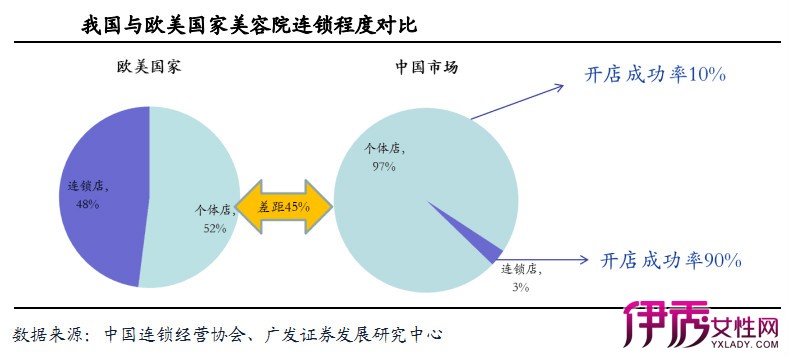 根据中国连锁经营协会数据,目前国内美容院连锁化比例仅为3%,而欧美国家则高达近半数: