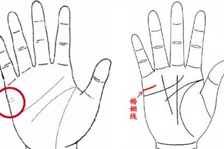 婚姻线,顾名思义就是表示婚姻状况的手相,我们可以通过婚姻线的纹路、形状等预测一个人的婚姻状况。婚姻线位于小指根部,这个部位常有多条小短纹,我们通常认为长而清晰的一条就是婚姻线。