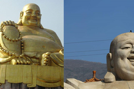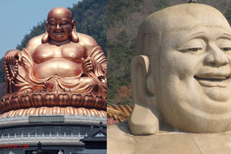 它整体的高度有四百多米,上面是由很多块小的花岗岩自然堆砌而成的。没有经过人工的打造,佛像的高度有将近三十米左右,宽度有四十多米,周边的长度更是有将近七十多你,整体是一个坐着的弥勒佛的形象。远远看去就非常的壮观,光滑的大光头,圆圆的肚子,周边的两棵大树,看上去就像是手里面的拐杖。